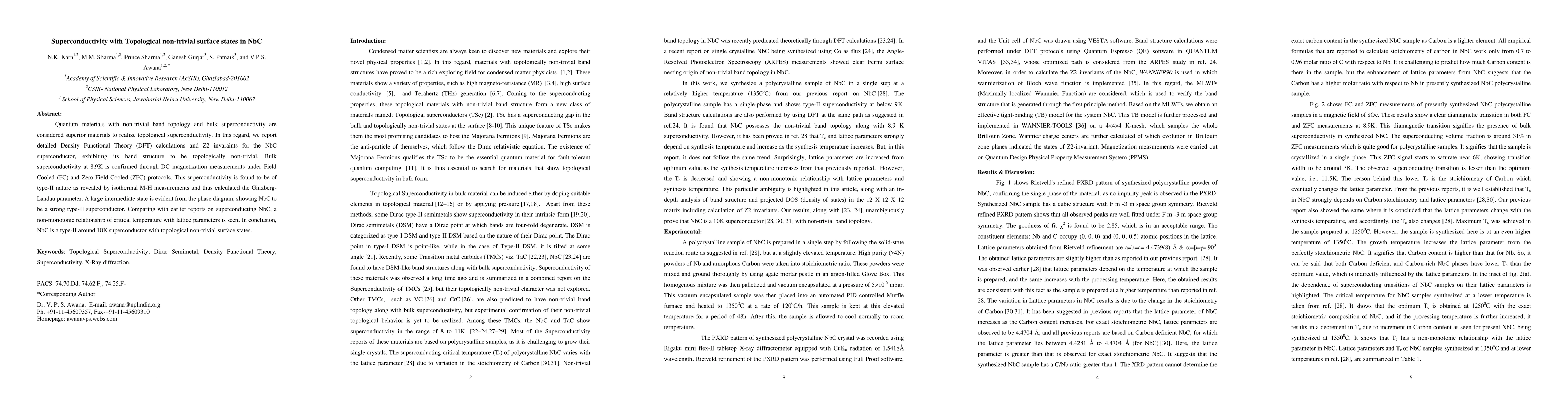 This paper reports on NbC superconductor exhibiting topologically non-trivial surface states and bulk superconductivity at 8.9K, confirmed by DC magnetization measurements. The material is identified as a strong type-II superconductor with a large intermediate state.