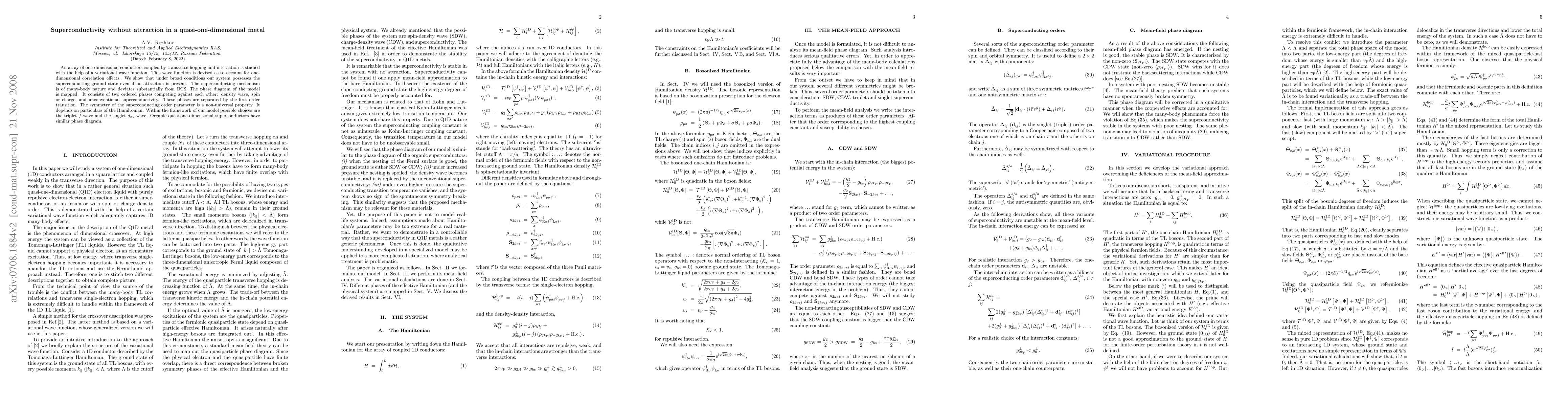 An array of one-dimensional conductors coupled by transverse hopping and interaction is studied with the help of a variational wave function. This wave function is devised as to account for one-dimensional correlation effects. We show that under broad conditions our system possesses the superconducting ground state even if no attraction is present. The superconducting mechanism is of many-body nature and deviates substantially from BCS. The phase diagram of the model is mapped. It consists of two ordered phases competing against each other: density wave, spin or charge, and unconventional superconductivity. These phases are separated by the first order transition. The symmetry of the superconducting order parameter is a non-universal property. It depends on particulars of the Hamiltonian. Within the framework of our model possible choices are the triplet $f$-wave and the singlet $d_{xy}$-wave. Organic quasi-one-dimensional superconductors have similar phase diagram.