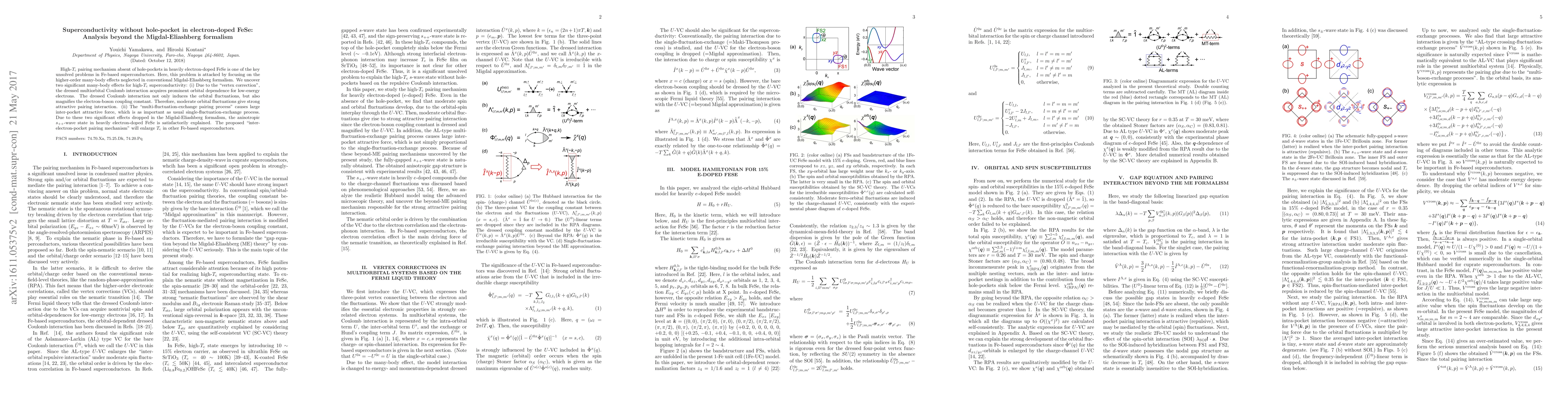 This paper investigates high-temperature superconductivity in electron-doped FeSe, revealing two overlooked many-body effects: significant orbital dependence from vertex correction and inter-pocket pairing via multi-fluctuation-exchange, explaining the $s_{++}$-wave state without requiring hole-pockets.