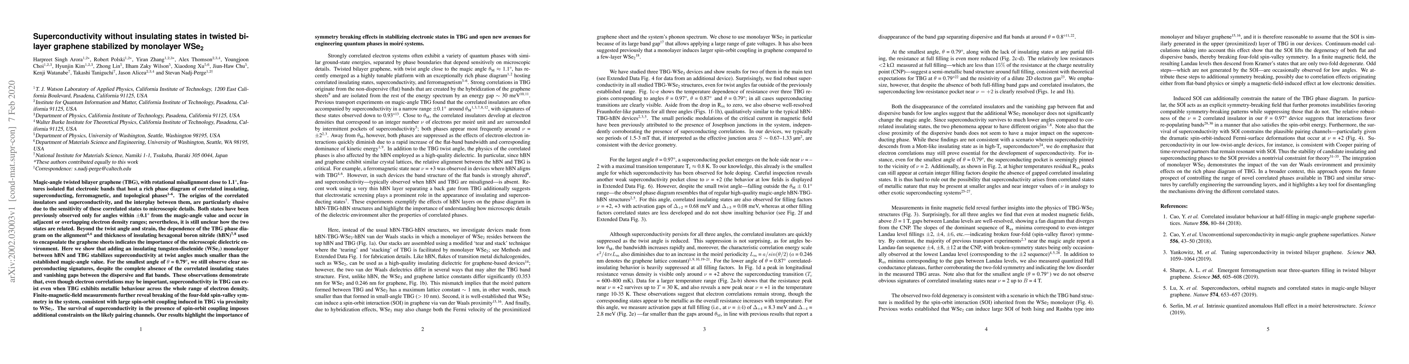 This paper demonstrates that superconductivity in twisted bilayer graphene can occur without correlated insulating states, stabilized by a monolayer of WSe$_2$ between hBN and graphene. This finding reveals that superconductivity can exist even when the graphene exhibits metallic behavior, highlighting the role of symmetry breaking effects in stabilizing electronic states.