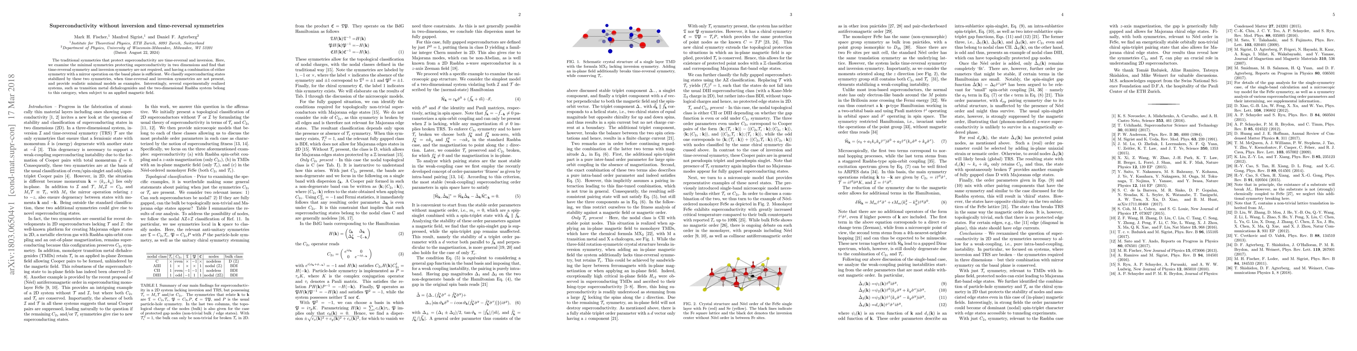 This paper explores superconductivity without traditional symmetries of time-reversal and inversion, identifying that a combination of these symmetries with a mirror operation can suffice. It classifies such superconducting states and provides examples from experimentally realized systems like transition metal dichalcogenides under magnetic fields.