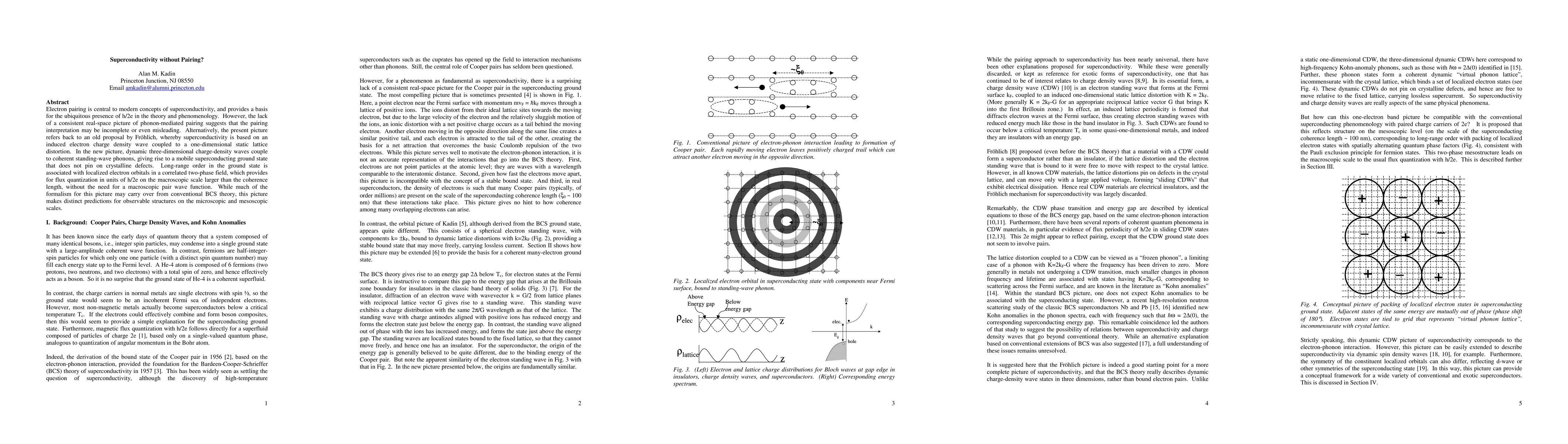 Electron pairing is central to modern concepts of superconductivity, and provides a basis for the ubiquitous presence of h/2e in the theory and phenomenology. However, the lack of a consistent real-space picture of phonon-mediated pairing suggests that the pairing interpretation may be incomplete or even misleading. Alternatively, the present picture refers back to an old proposal by Frohlich, whereby superconductivity is based on an induced electron charge density wave coupled to a one-dimensional static lattice distortion. In the new picture, dynamic three-dimensional charge-density waves couple to coherent standing-wave phonons, giving rise to a mobile superconducting ground state that does not pin on crystalline defects. Long-range order in the ground state is associated with localized electron orbitals in a correlated two-phase field, which provides for flux quantization in units of h/2e on the macroscopic scale larger than the coherence length, without the need for a macroscopic pair wave function. While much of the formalism for this picture may carry over from conventional BCS theory, this picture makes distinct predictions for observable structures on the microscopic and mesoscopic scales.