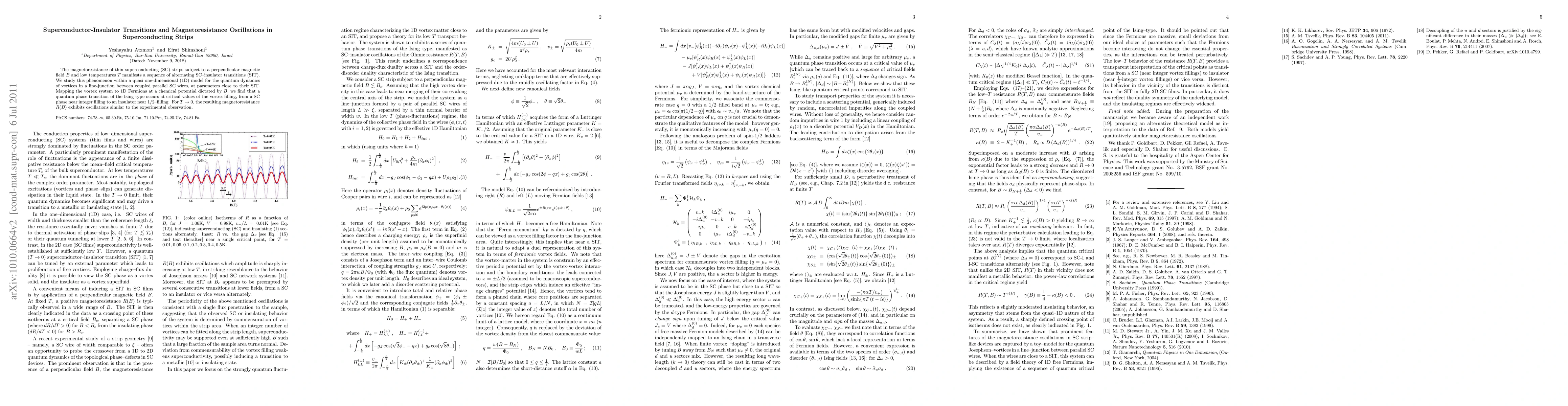 The magnetoresistance of thin superconducting strips subject to a perpendicular magnetic field B and low temperatures T manifests a sequence of alternating superconductor-insulator transitions (SIT). We study this phenomenon within a quasi one-dimensional (1D) model for the quantum dynamics of vortices in a line-junction between coupled parallel SC wires, at parameters close to their SIT. Mapping the vortex system to 1D Fermions at a chemical potential dictated by B, we find that a quantum phase transition of the Ising type occurs at critical values of the vortex filling, from a SC phase near integer filling to an insulator near 1/2-filling. For T->0, the resulting magnetoresistance R(B) exhibits oscillations similar to the experimental observation.