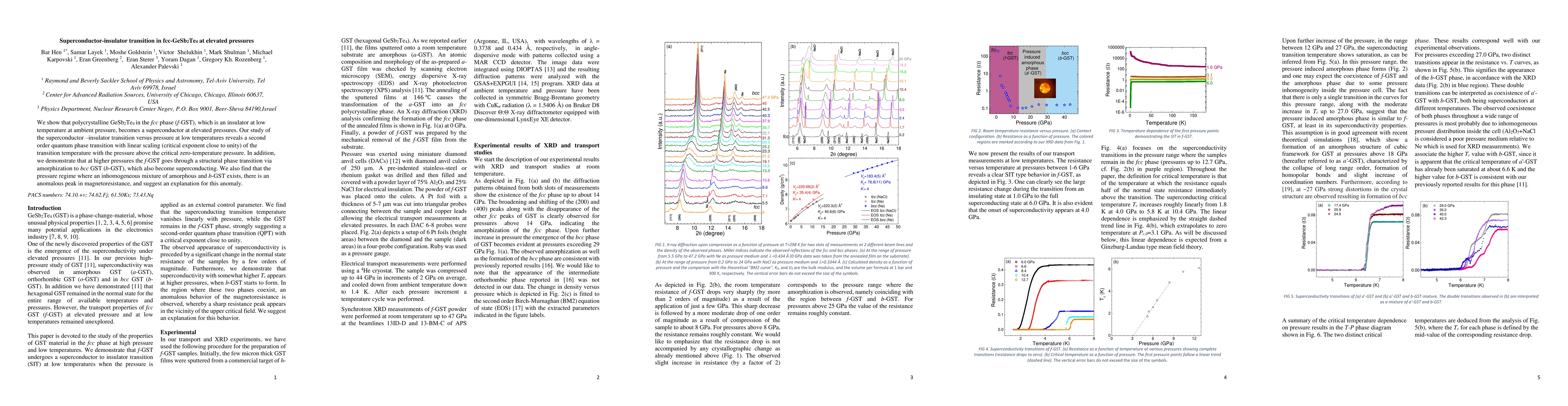 We show that polycrystalline GeSb2Te4 in the fcc phase (f-GST), which is an insulator at low temperature at ambient pressure, becomes a superconductor at elevated pressures. Our study of the superconductor to insulator transition versus pressure at low temperatures reveals a second order quantum phase transition with linear scaling (critical exponent close to unity) of the transition temperature with the pressure above the critical zero-temperature pressure. In addition, we demonstrate that at higher pressures the f-GST goes through a structural phase transition via amorphization to bcc GST (b-GST), which also become superconducting. We also find that the pressure regime where an inhomogeneous mixture of amorphous and b-GST exists, there is an anomalous peak in magnetoresistance, and suggest an explanation for this anomaly.