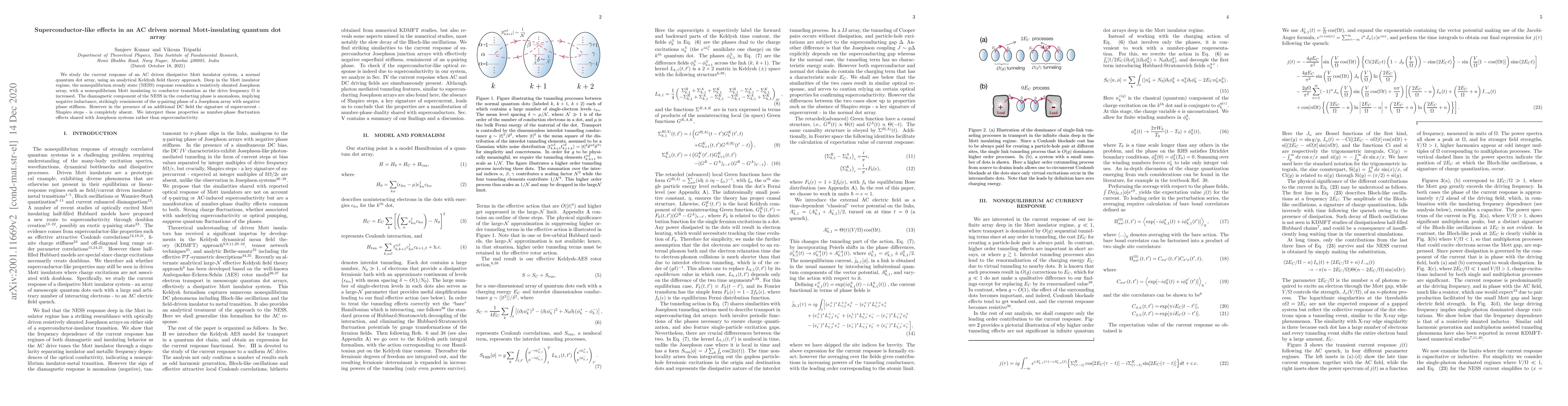 Summary: This study explores current responses in AC-driven quantum dot arrays, revealing superconductor-like behaviors due to number-phase fluctuations, but without the signature of supercurrent, suggesting these effects are akin to Josephson arrays rather than true superconductivity.