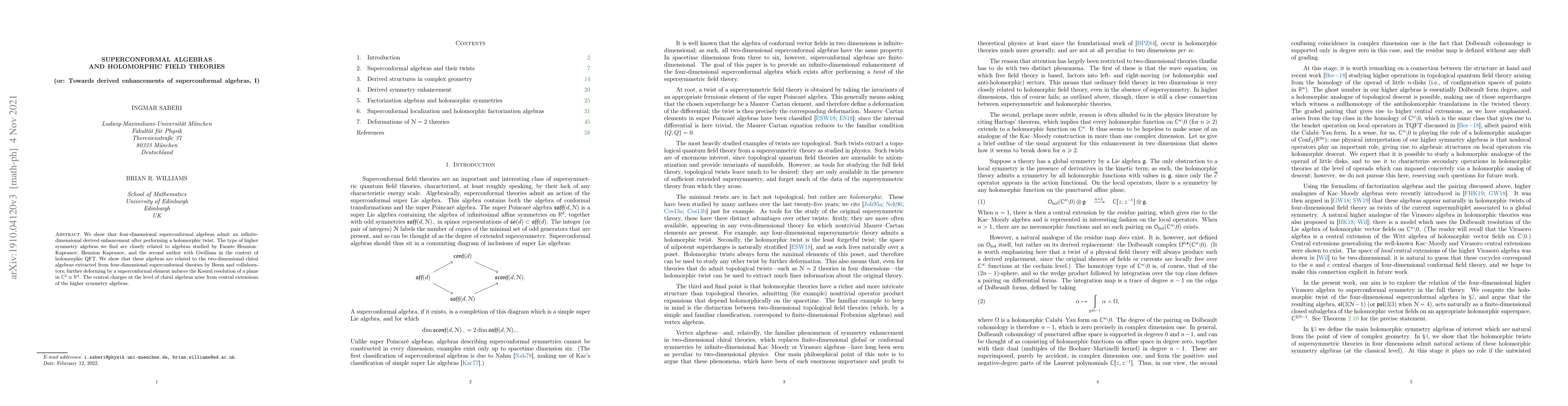 This paper demonstrates that four-dimensional superconformal algebras can be enhanced to infinite-dimensional derived algebras via a holomorphic twist, linking these structures to two-dimensional chiral algebras and the Koszul resolution of $\mathbb{R}^4$. Central charges in chiral algebras emerge from central extensions of these higher symmetry algebras.