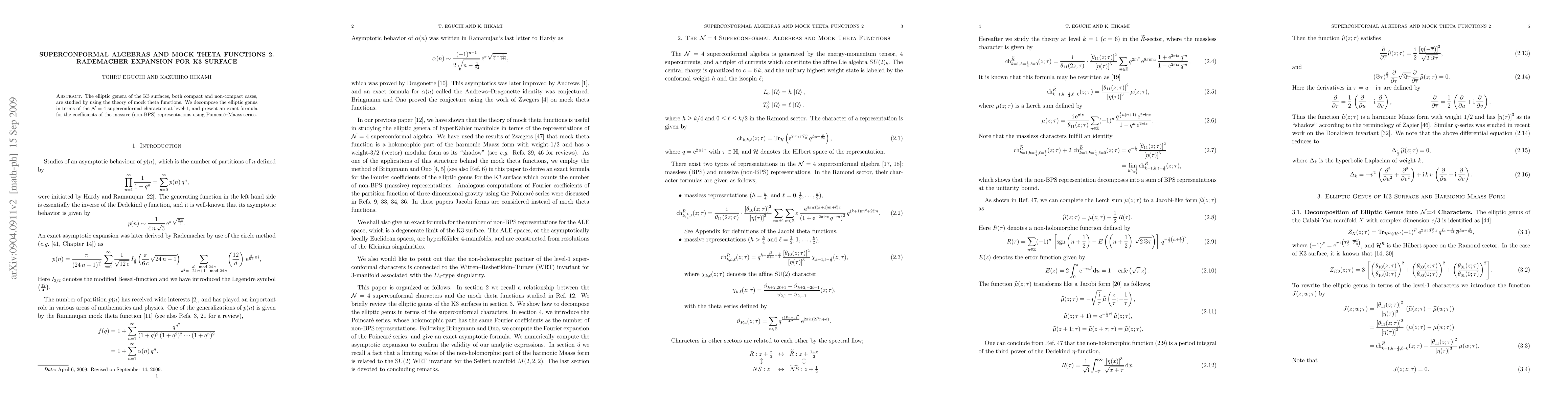 This paper explores the elliptic genera of K3 surfaces through the lens of mock theta functions, decomposing them into N=4 superconformal characters at level-1 and providing an exact formula for the coefficients of massive representations via Poincare-Maass series.