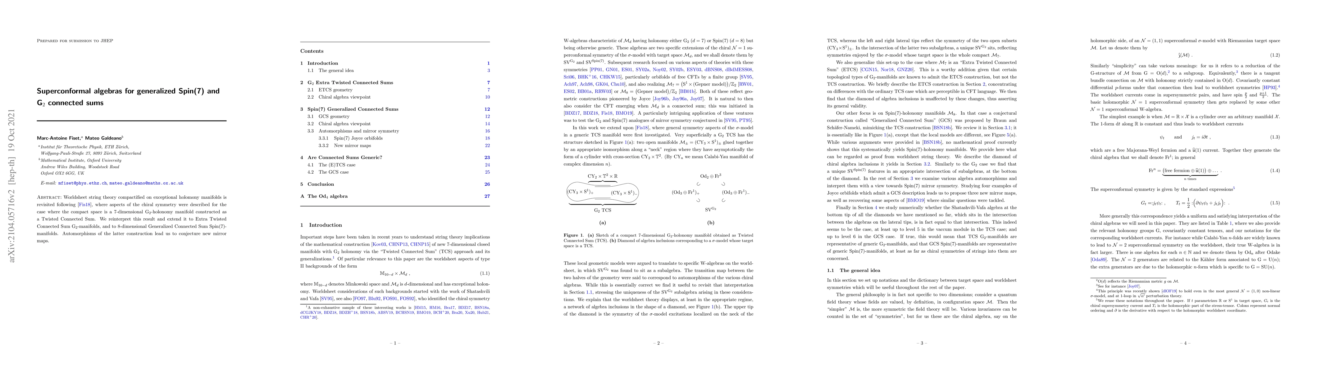 Worldsheet string theory compactified on exceptional holomony manifolds is revisited following arXiv:1809.06376, where aspects of the chiral symmetry were described for the case where the compact space is a 7-dimensional G$_2$-holonomy manifold constructed as a Twisted Connected Sum. We reinterpret this result and extend it to Extra Twisted Connected Sum G$_2$-manifolds, and to 8-dimensional Generalized Connected Sum Spin(7)-manifolds. Automorphisms of the latter construction lead us to conjecture new mirror maps.