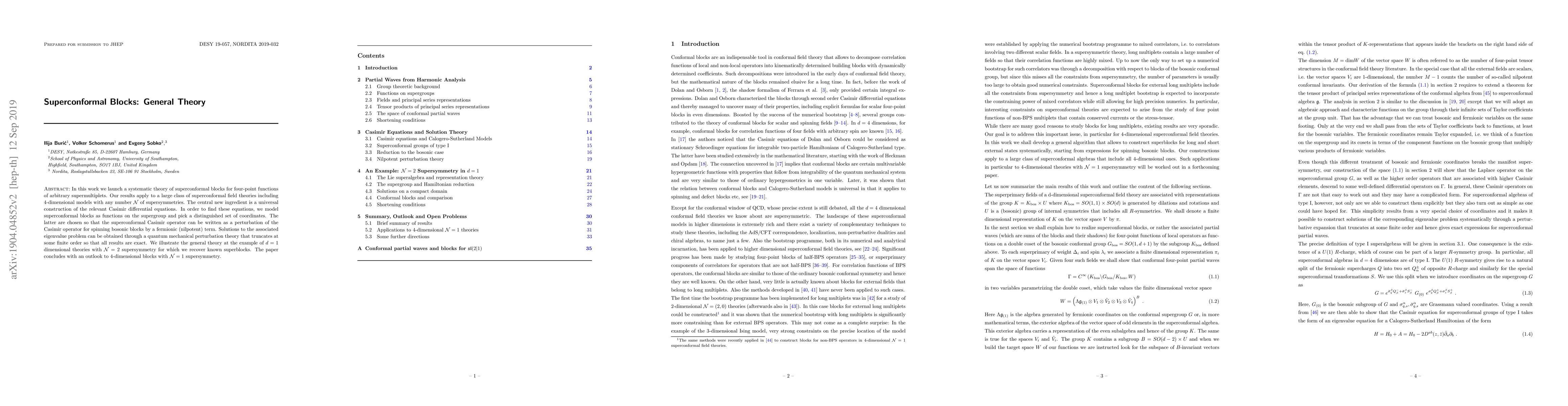 This paper develops a comprehensive theory for superconformal blocks in four-point functions across various superconformal field theories, utilizing a universal construction of Casimir differential equations. The method truncates at a finite order, ensuring exact solutions, and is demonstrated through $\mathcal{N}=2$ supersymmetry in 1-dimensional theories.