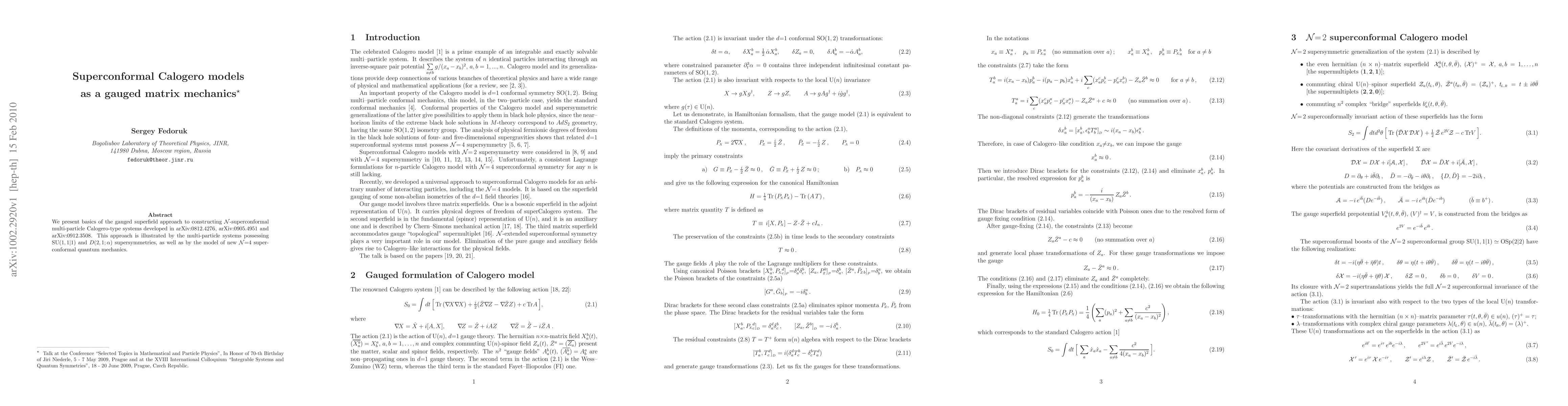 We present basics of the gauged superfield approach to constructing N-superconformal multi-particle Calogero-type systems developed in arXiv:0812.4276, arXiv:0905.4951 and arXiv:0912.3508. This approach is illustrated by the multi-particle systems possessing SU(1,1|1) and D(2,1;\alpha) supersymmetries, as well as by the model of new N=4 superconformal quantum mechanics.