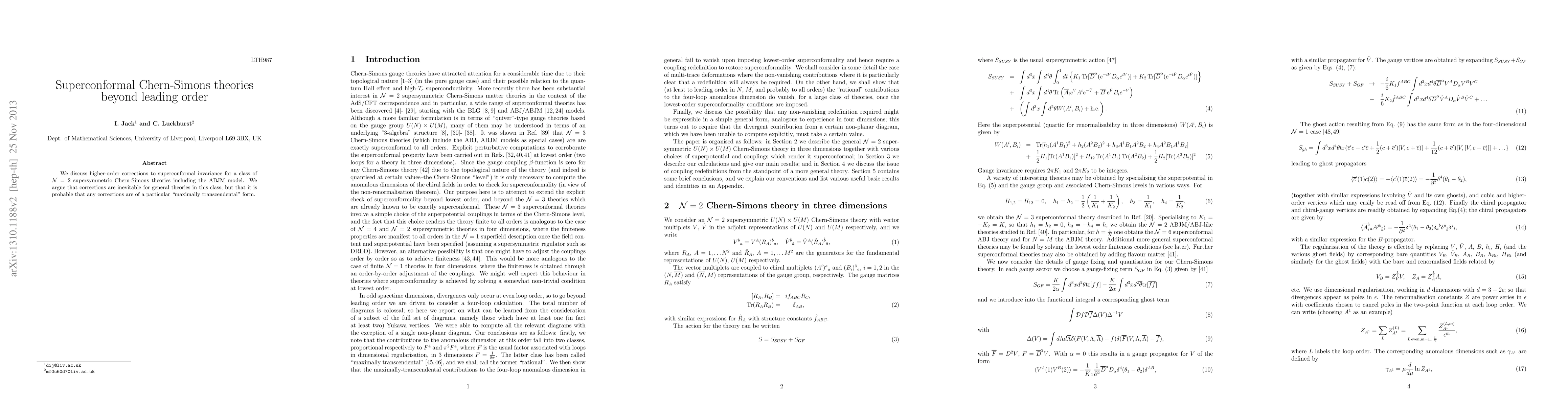 Summary: This paper investigates higher-order corrections to superconformal invariance in N=2 supersymmetric Chern-Simons theories, including the ABJM model, arguing that while corrections are inevitable, they likely take a "maximally transcendental" form.