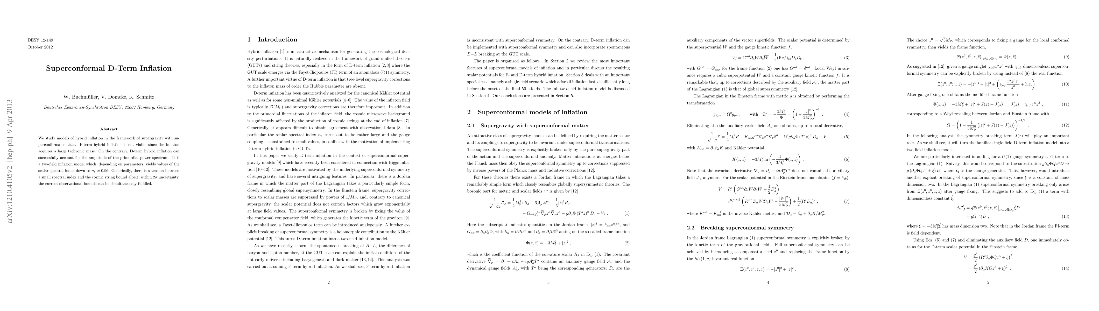 We study models of hybrid inflation in the framework of supergravity with superconformal matter. F-term hybrid inflation is not viable since the inflaton acquires a large tachyonic mass. On the contrary, D-term hybrid inflation can successfully account for the amplitude of the primordial power spectrum. It is a two-field inflation model which, depending on parameters, yields values of the scalar spectral index down to n_s ~ 0.96. Generically, there is a tension between a small spectral index and the cosmic string bound albeit, within 2-sigma uncertainty, the current observational bounds can be simultaneously fulfilled.