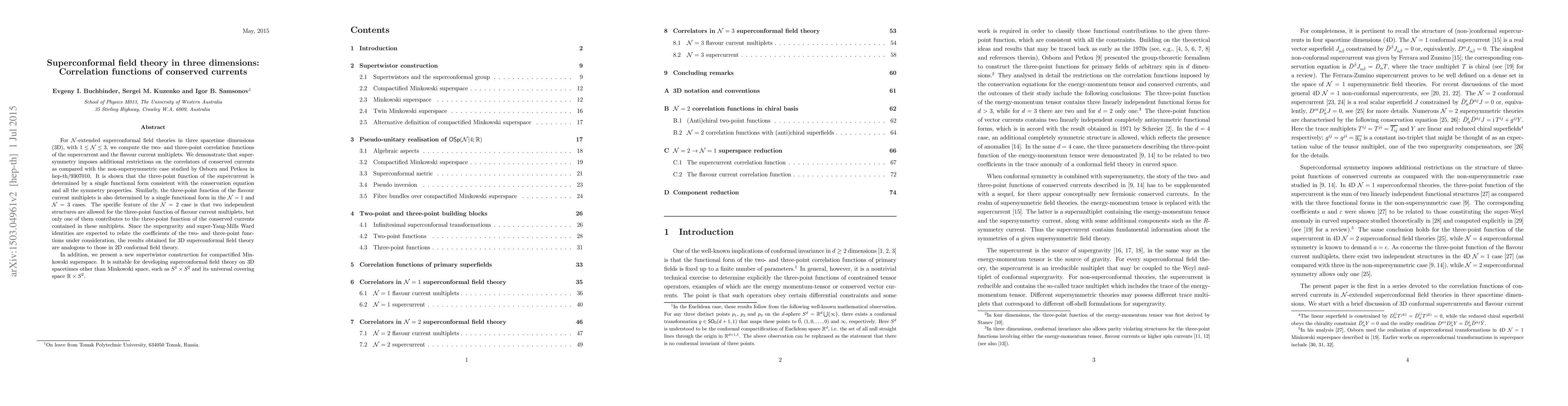 This paper computes two- and three-point correlation functions of conserved currents in N-extended superconformal field theories in 3D, showing that supersymmetry imposes additional restrictions on these correlators compared to non-supersymmetric cases. The results demonstrate a single functional form for three-point functions in most cases, with a notable exception for the N=2 case where two structures exist but only one contributes to conserved current functions. Additionally, a new supertwistor construction for compactified Minkowski superspace is introduced for developing superconformal field theory in various 3D spacetimes.