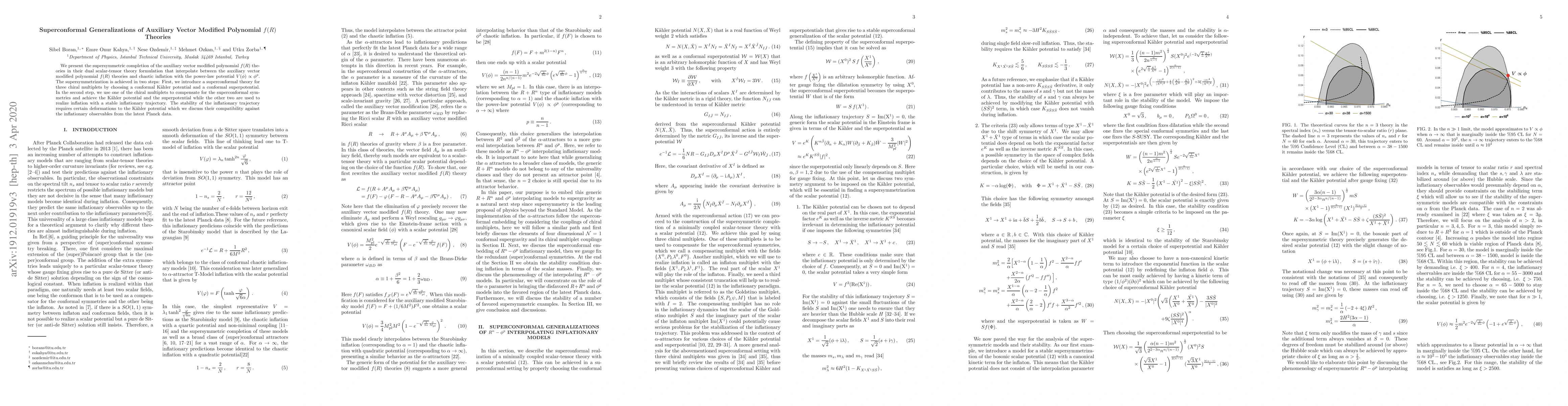 We present the supersymmetric completion of the auxiliary vector modified polynomial $f(R)$ theories in their dual scalar-tensor theory formulation that interpolate between the auxiliary vector modified polynomial $f(R)$ theories and chaotic inflation with the power-law potential $V(\phi) \propto \phi^p$. The supersymmetrization is achieved in two steps: First, we introduce a superconformal theory for three chiral multiplets by choosing a conformal K\"ahler potential and a conformal superpotential. In the second step, we use one of the chiral multiplets to compensate for the superconformal symmetries and achieve the K\"ahler potential and the superpotential while the other two are used to realize inflation with a stable inflationary trajectory. The stability of the inflationary trajectory requires certain deformations to the K\"ahler potential which we discuss their compatibility against the inflationary observables from the latest Planck data.