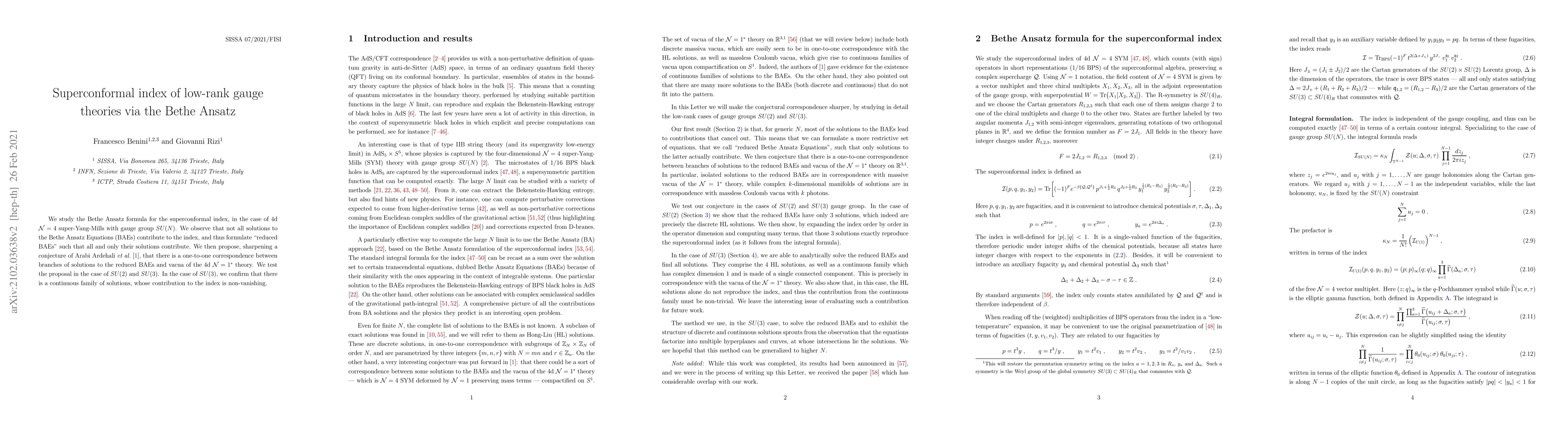 Researchers develop a method to calculate the superconformal index of low-rank gauge theories using the Bethe Ansatz, finding a one-to-one correspondence between branch solutions and vacua of related theories.