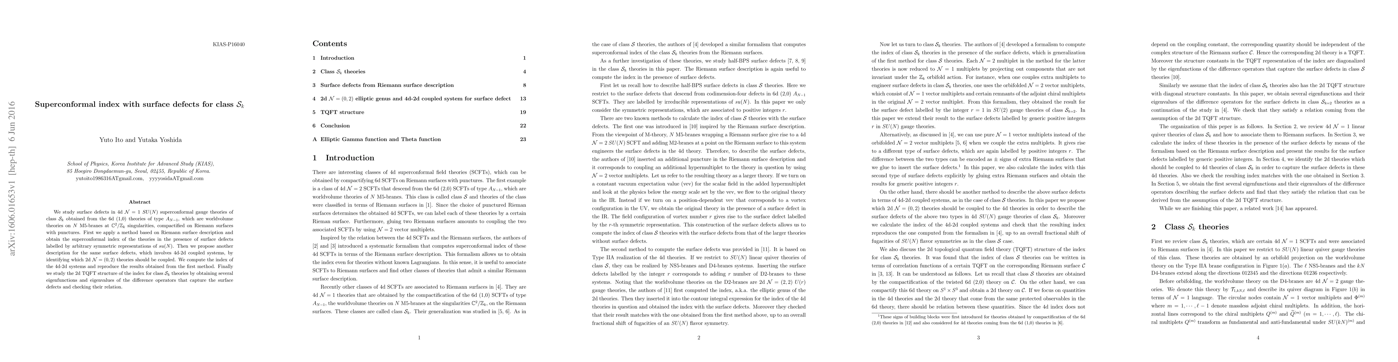 This paper investigates surface defects in 4d $\mathcal{N}=1$ $SU(N)$ superconformal gauge theories of class $\mathcal{S}_k$, deriving the superconformal index using Riemann surface methods and 4d-2d coupled systems, and analyzing the topological quantum field theory (TQFT) structure of the index.