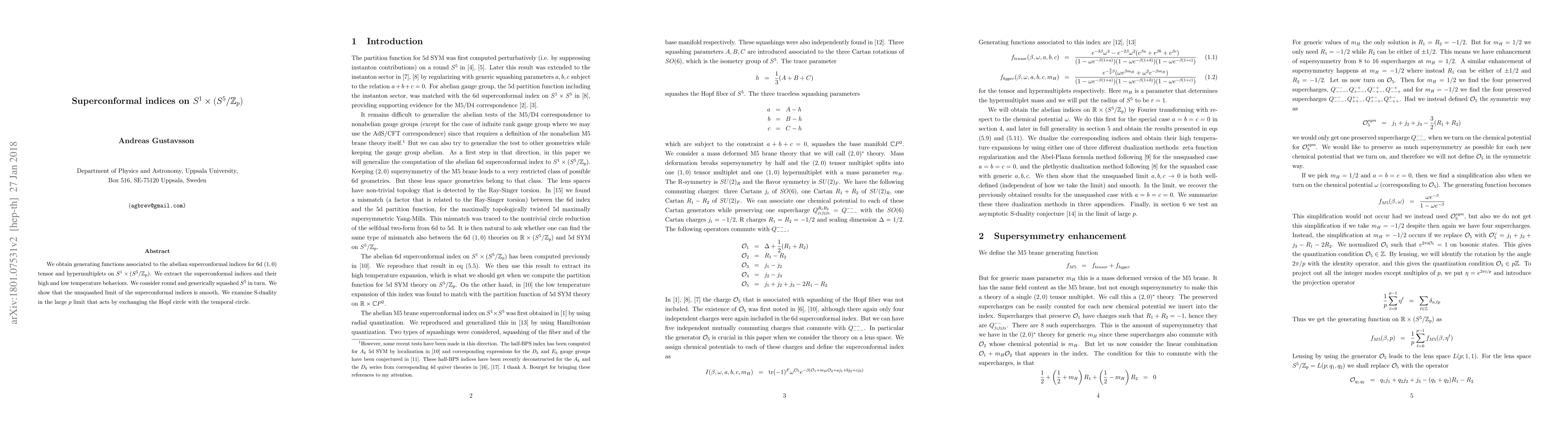 We obtain generating functions associated to the abelian superconformal indices for 6d $(1,0)$ tensor and hypermultiplets on $S^1\times (S^5/Z_p)$. We extract the superconformal indices and their high and low temperature behaviors. We consider round and generically squashed $S^5$ in turn. We show that the unsquashed limit of the superconformal indices is smooth. We examine S-duality in the large $p$ limit that acts by exchanging the Hopf circle with the temporal circle.