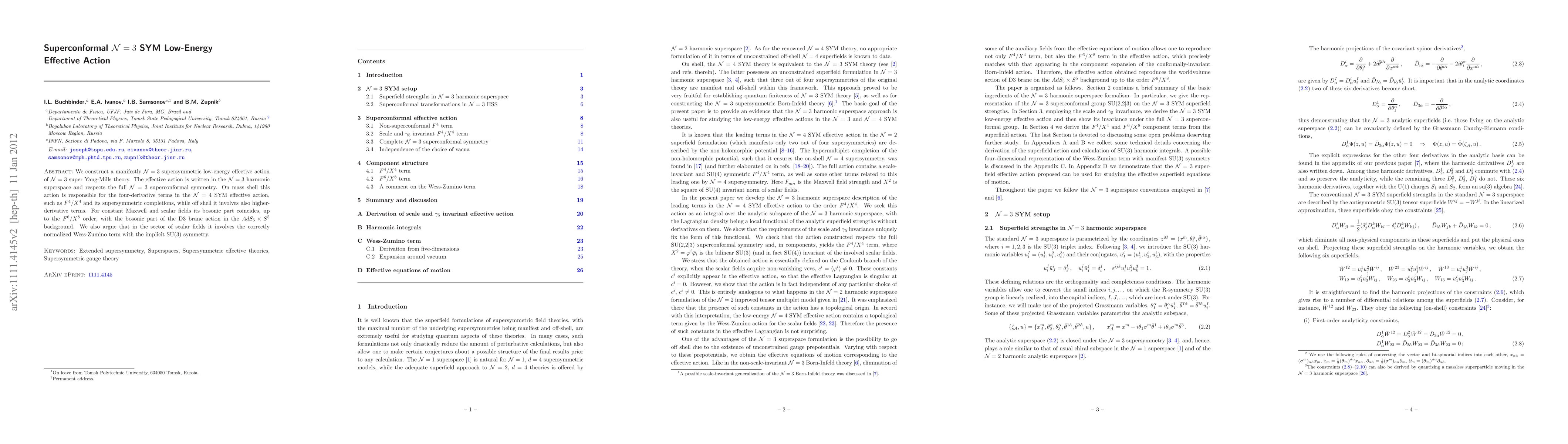 This paper constructs a low-energy effective action for N=3 super Yang-Mills theory in harmonic superspace, maintaining full N=3 superconformal symmetry. It includes four-derivative terms relevant to N=4 SYM and higher-derivative terms, and matches the bosonic part of the D3 brane action in AdS_5 x S^5 up to F^6/X^8 order.