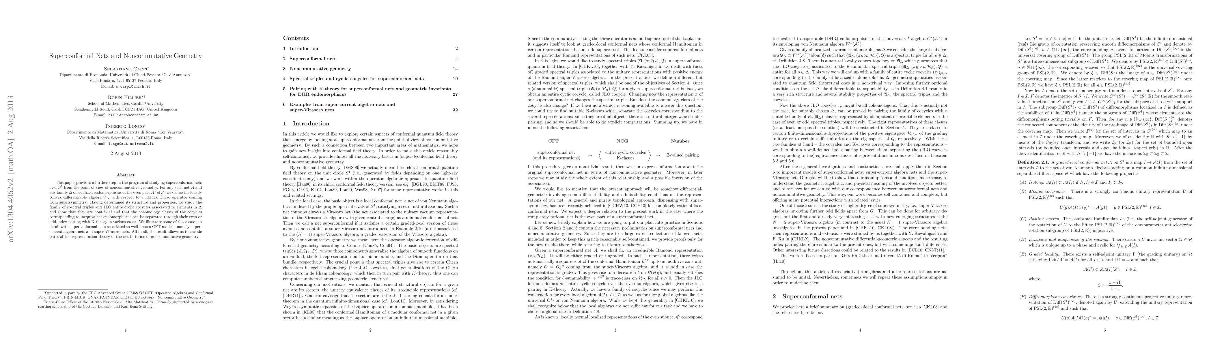 This paper explores superconformal nets via noncommutative geometry, defining a locally convex differentiable algebra linked to a natural Dirac operator. It studies spectral triples and cocycles associated with localized endomorphisms, demonstrating their nontriviality and distinct cohomology classes, and applies these findings to superconformal nets from well-known CFT models.