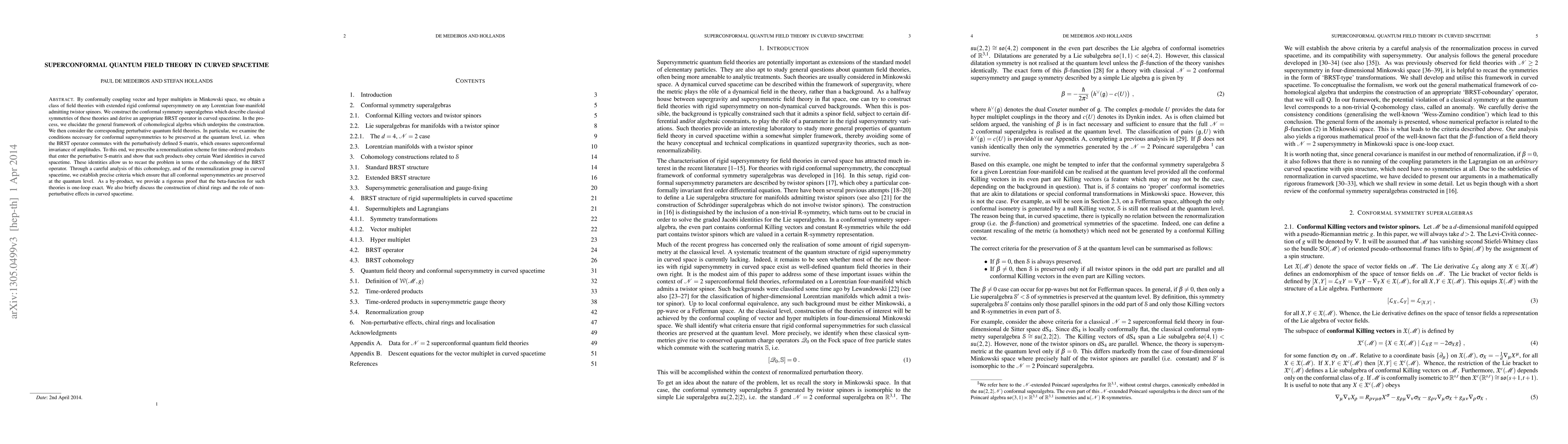 By conformally coupling vector and hyper multiplets in Minkowski space, we obtain a class of field theories with extended rigid conformal supersymmetry on any Lorentzian four-manifold admitting twistor spinors. We construct the conformal symmetry superalgebras which describe classical symmetries of these theories and derive an appropriate BRST operator in curved spacetime. In the process, we elucidate the general framework of cohomological algebra which underpins the construction. We then consider the corresponding perturbative quantum field theories. In particular, we examine the conditions necessary for conformal supersymmetries to be preserved at the quantum level, i.e. when the BRST operator commutes with the perturbatively defined S-matrix, which ensures superconformal invariance of amplitudes. To this end, we prescribe a renormalization scheme for time-ordered products that enter the perturbative S-matrix and show that such products obey certain Ward identities in curved spacetime. These identities allow us to recast the problem in terms of the cohomology of the BRST operator. Through a careful analysis of this cohomology, and of the renormalization group in curved spacetime, we establish precise criteria which ensure that all conformal supersymmetries are preserved at the quantum level. As a by-product, we provide a rigorous proof that the beta-function for such theories is one-loop exact. We also briefly discuss the construction of chiral rings and the role of non-perturbative effects in curved spacetime.