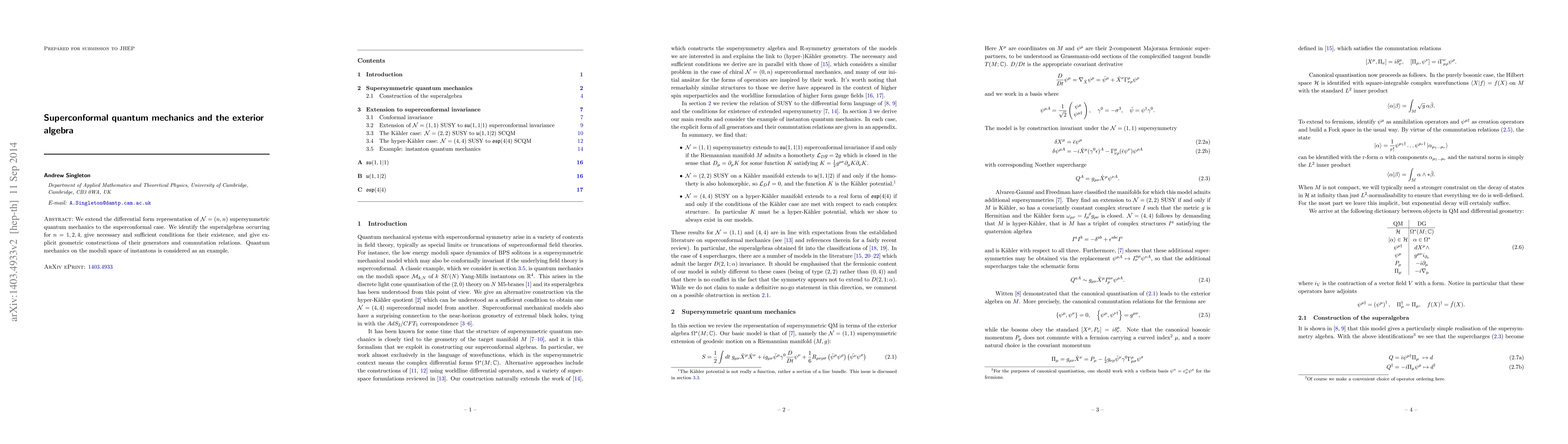 We extend the differential form representation of N = (n,n) supersymmetric quantum mechanics to the superconformal case. We identify the superalgebras occurring for n = 1,2,4, give necessary and sufficient conditions for their existence, and give explicit geometric constructions of their generators and commutation relations. Quantum mechanics on the moduli space of instantons is considered as an example.