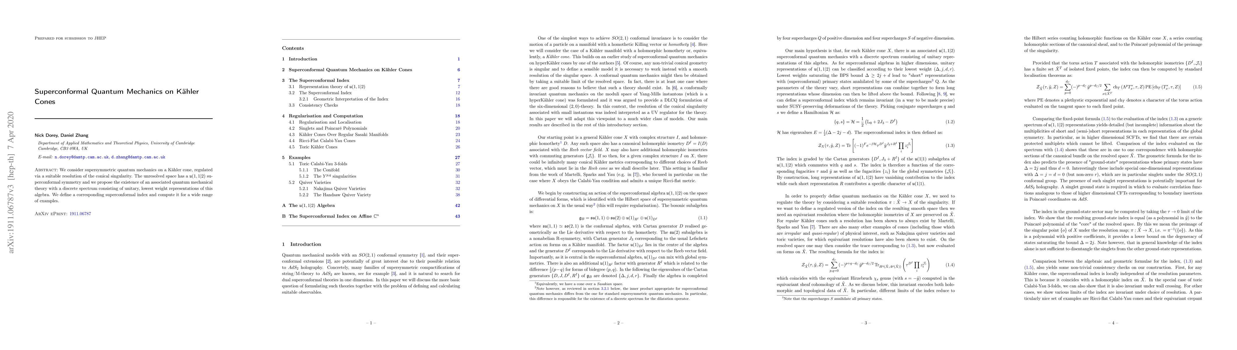 This paper explores supersymmetric quantum mechanics on K\"ahler cones, proposing a $\mathfrak{u}(1,1|2)$ superconformal symmetry with a discrete spectrum of unitary, lowest weight representations. It defines and computes a superconformal index for various examples.