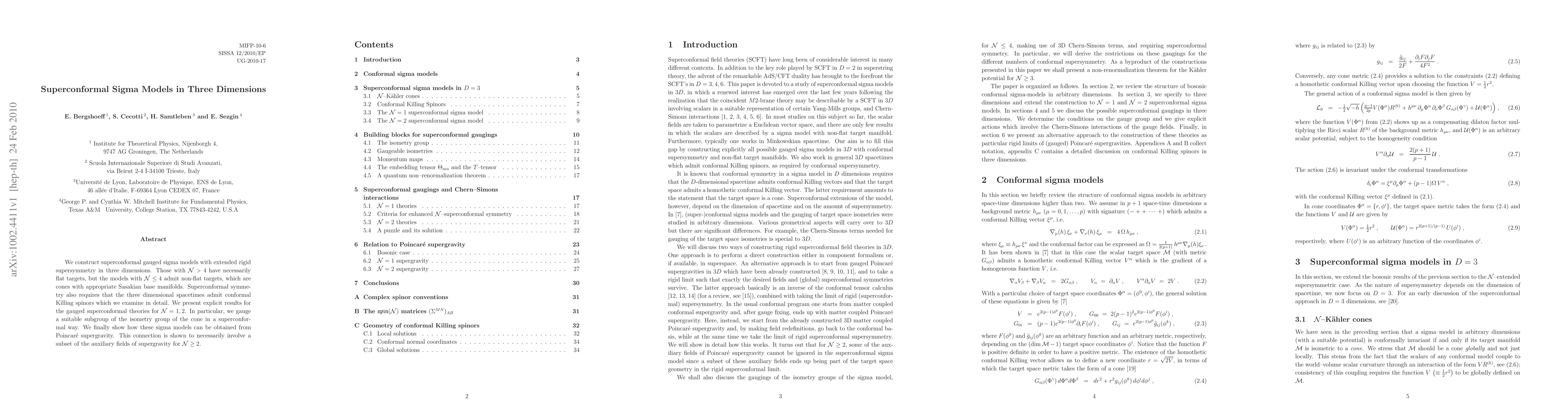 This paper constructs superconformal gauged sigma models in three dimensions with extended supersymmetry, showing that models with N ≤ 4 allow non-flat targets, specifically cones with Sasakian bases. The authors detail the conformal Killing spinors required for these models and present explicit results for N=1,2, demonstrating their connection to Poincaré supergravity.