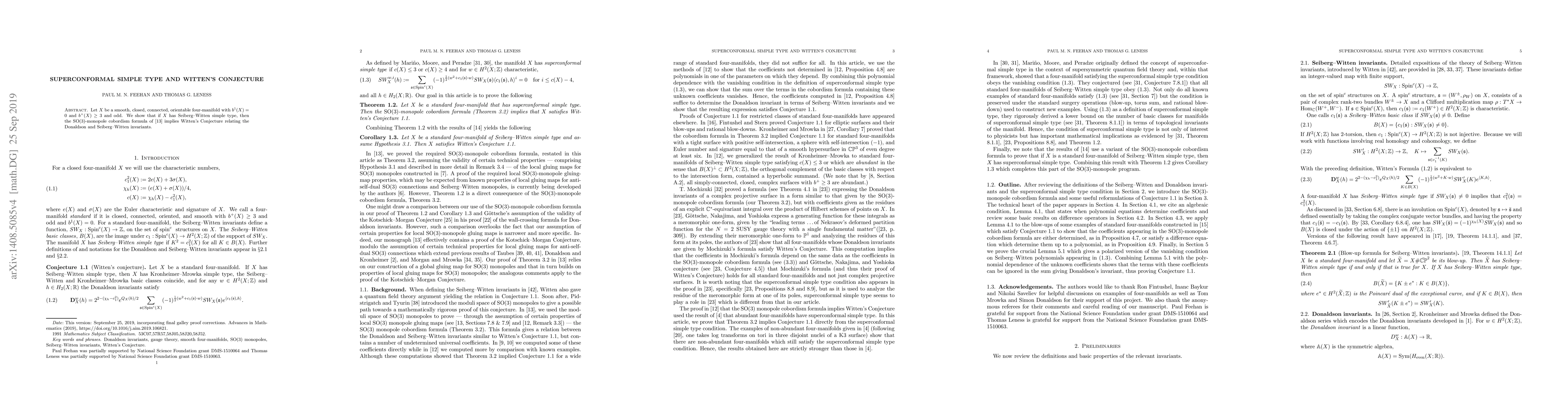 Let $X$ be a smooth, closed, connected, orientable four-manifold with $b^1(X)=0$ and $b^+(X)\geq 3$ and odd. We show that if $X$ has Seiberg-Witten simple type, then the SO(3)-monopole cobordism formula of Feehan and Leness (2002) implies Witten's Conjecture relating the Donaldson and Seiberg-Witten invariants.