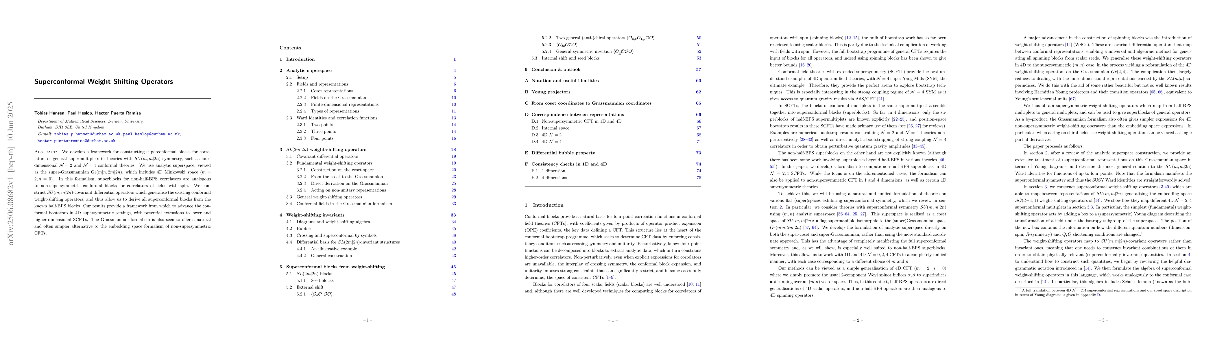 This research introduces a framework for constructing superconformal blocks in theories with $SU(m,m|2n)$ symmetry, generalizing existing weight-shifting operators. It uses analytic superspace and provides a simpler alternative to the embedding space formalism, offering potential advancements in the conformal bootstrap for 4D supersymmetric settings and beyond.