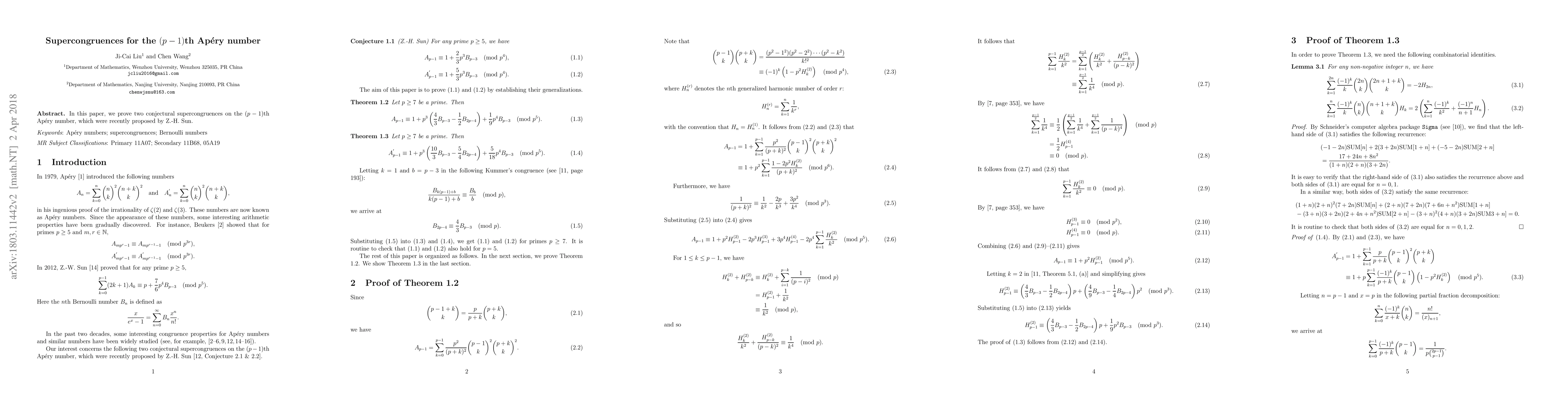 This paper proves two conjectured supercongruences concerning the $(p-1)$th Apéry number, originally proposed by Z.-H. Sun, enhancing our understanding of these important number-theoretic sequences.