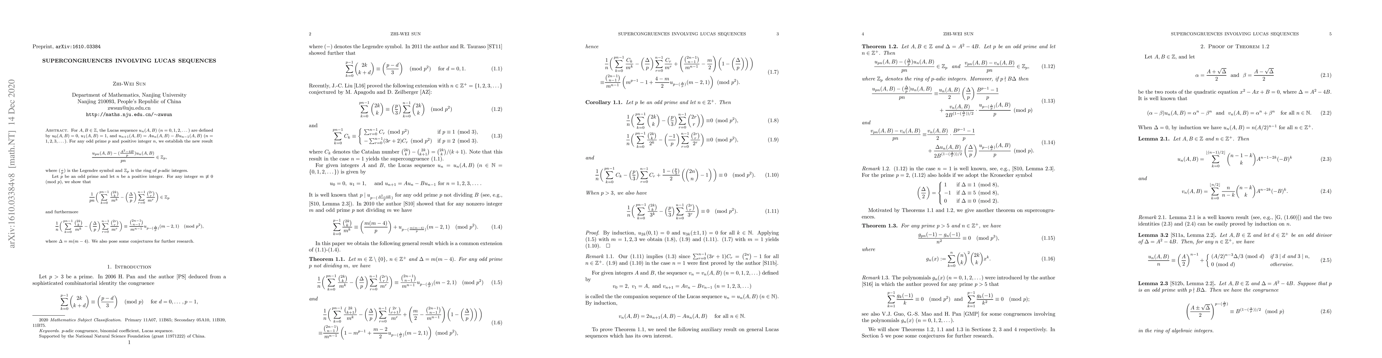 For $A,B\in\mathbb Z$, the Lucas sequence $u_n(A,B)\ (n=0,1,2,\ldots)$ are defined by $u_0(A,B)=0$, $u_1(A,B)=1$, and $u_{n+1}(A,B) = Au_n(A,B)-Bu_{n-1}(A,B)$ $(n=1,2,3,\ldots).$ For any odd prime $p$ and positive integer $n$, we establish the new result $$\frac{u_{pn}(A,B) - (\frac{A^2-4B}p) u_n(A,B)}{pn} \in \mathbb Z_p,$$ where $(\frac{\cdot}p)$ is the Legendre symbol and $\mathbb Z_p$ is the ring of $p$-adic integers. Let $p$ be an odd prime and let $n$ be a positive integer. For any integer $m\not\equiv0\pmod p$, we show that $$\frac1{pn}\bigg(\sum_{k=0}^{pn-1} \frac{\binom{2k}k}{m^k} -\left(\frac{\Delta}p\right) \sum_{r=0}^{n-1}\frac{\binom{2r}r}{m^r}\bigg)\in\mathbb Z_p$$ and furthermore $$\frac1n\bigg(\sum_{k=0}^{pn-1} \frac{\binom{2k}k}{m^k} -\left(\frac{\Delta}p\right) \sum_{r=0}^{n-1}\frac{\binom{2r}r}{m^r}\bigg)\equiv \frac{\binom{2n-1}{n-1}}{m^{n-1}} u_{p-(\frac{\Delta}p)}(m-2,1) \pmod{p^2}$$ where $\Delta=m(m-4)$. We also pose some conjectures for further research.
