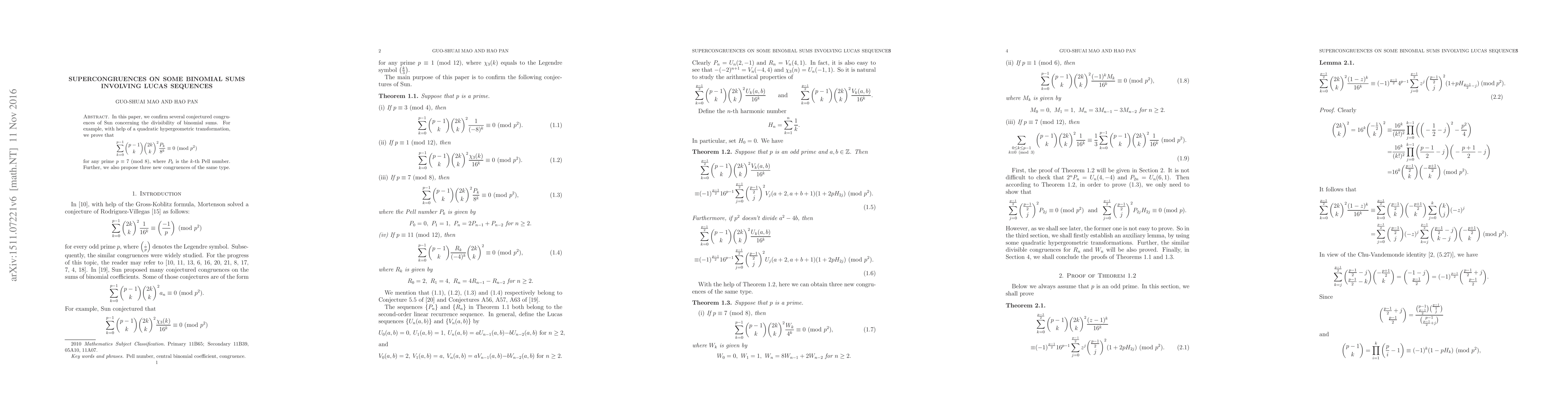 In this paper, we confirm several conjectured congruences of Sun concerning the divisibility of binomial sums. For example, with help of a quadratic hypergeometric transformation, we prove that $$ \sum_{k=0}^{p-1}\binom{p-1}k\binom{2k}k^2\frac{P_k}{8^k}\equiv0\pmod{p^2} $$ for any prime $p\equiv 7\mod{8}$, where $P_k$ is the $k$-th Pell number. Further, we also propose three new congruences of the same type.