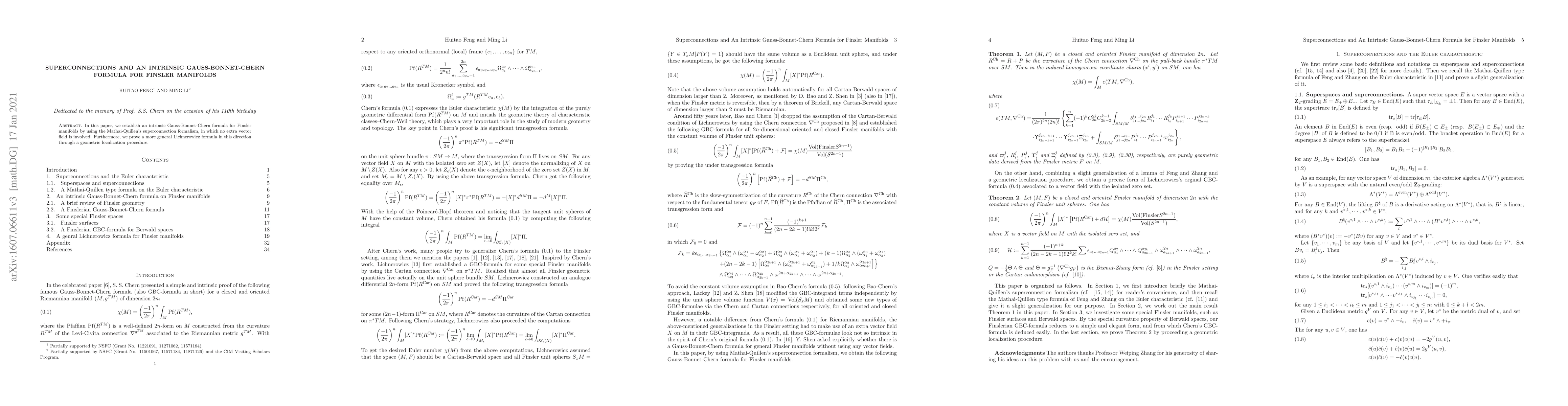 This paper establishes an intrinsic Gauss-Bonnet-Chern formula for Finsler manifolds using Mathai-Quillen's superconnection formalism, avoiding the need for extra vector fields. It also proves a generalized Lichnerowicz formula via a geometric localization procedure.