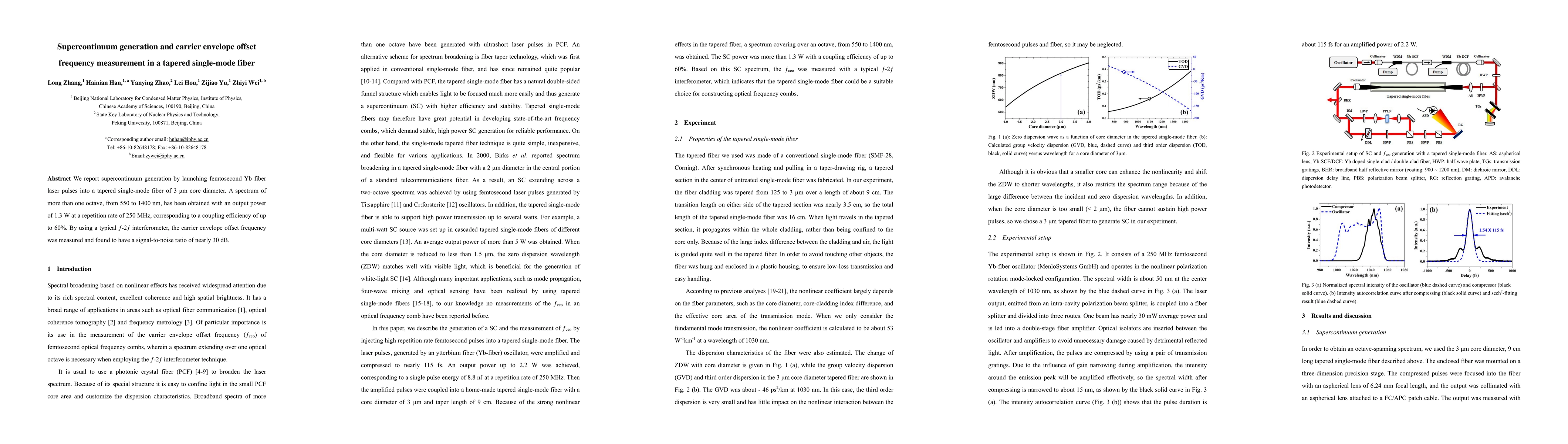 This paper reports on the generation of a broadband supercontinuum spectrum of over one octave using femtosecond Yb fiber laser pulses in a tapered single-mode fiber, achieving an output power of 1.3 W with a high coupling efficiency. The carrier envelope offset frequency was also measured with a high signal-to-noise ratio using an f-2f interferometer.