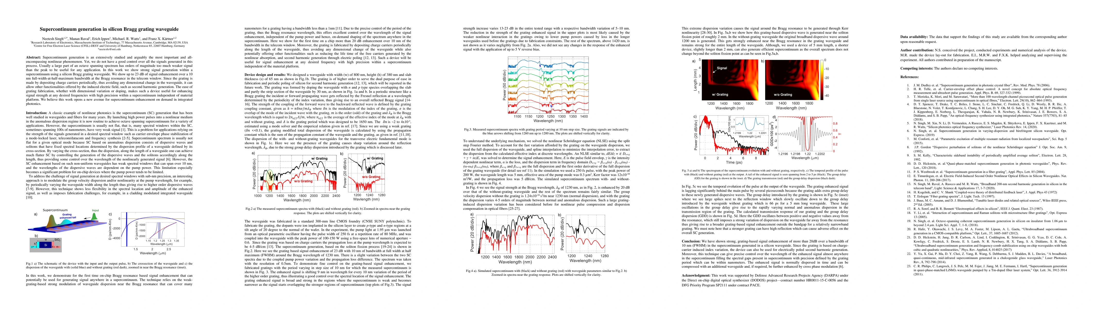 This research demonstrates a silicon Bragg grating waveguide that significantly enhances signal strength within a supercontinuum, achieving up to 23 dB of signal boost over a 10 nm bandwidth at the Bragg resonance in the telecom window, paving the way for precise, material-independent supercontinuum enhancement in integrated photonics.