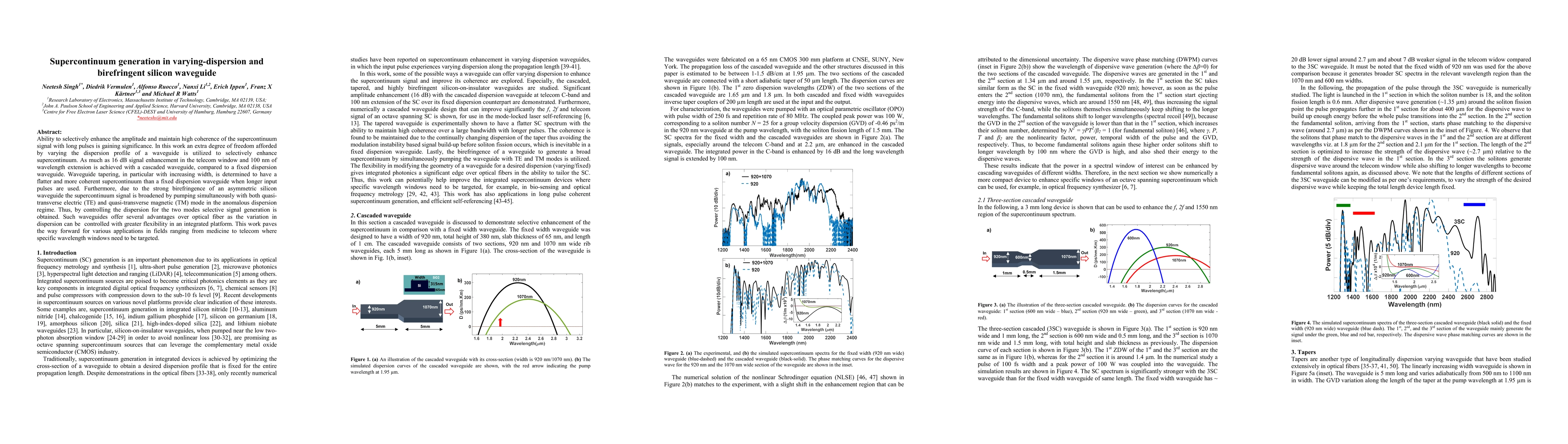 Ability to selectively enhance the amplitude and maintain high coherence of the supercontinuum signal with long pulses is gaining significance. In this work an extra degree of freedom afforded by varying the dispersion profile of a waveguide is utilized to selectively enhance supercontinuum. As much as 16 dB signal enhancement in the telecom window and 100 nm of wavelength extension is achieved with a cascaded waveguide, compared to a fixed dispersion waveguide. Waveguide tapering, in particular with increasing width, is determined to have a flatter and more coherent supercontinuum than a fixed dispersion waveguide when longer input pulses are used. Furthermore, due to the strong birefringence of an asymmetric silicon waveguide the supercontinuum signal is broadened by pumping simultaneously with both quasitransverse electric (TE) and quasi-transverse magnetic (TM) mode in the anomalous dispersion regime. Thus, by controlling the dispersion for the two modes selective signal generation is obtained. Such waveguides offer several advantages over optical fiber as the variation in dispersion can be controlled with greater flexibility in an integrated platform. This work paves the way forward for various applications in fields ranging from medicine to telecom where specific wavelength windows need to be targeted.