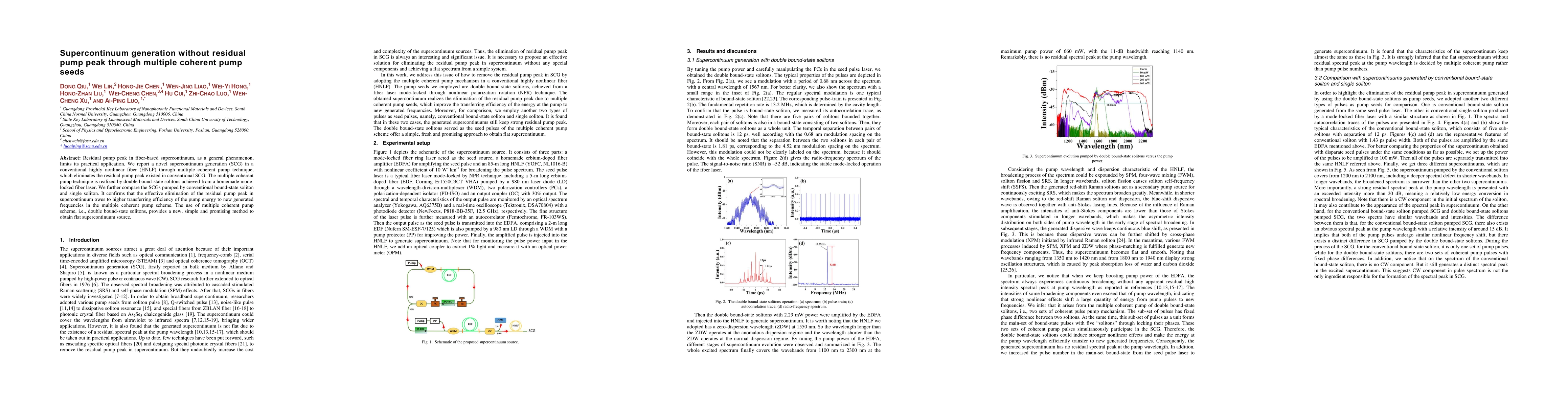 This paper presents a novel supercontinuum generation technique using multiple coherent pump seeds, specifically double bound-state solitons, to eliminate the residual pump peak in fiber-based supercontinua. This method enhances the transfer efficiency of pump energy to new frequencies, resulting in a flatter supercontinuum spectrum compared to conventional methods.