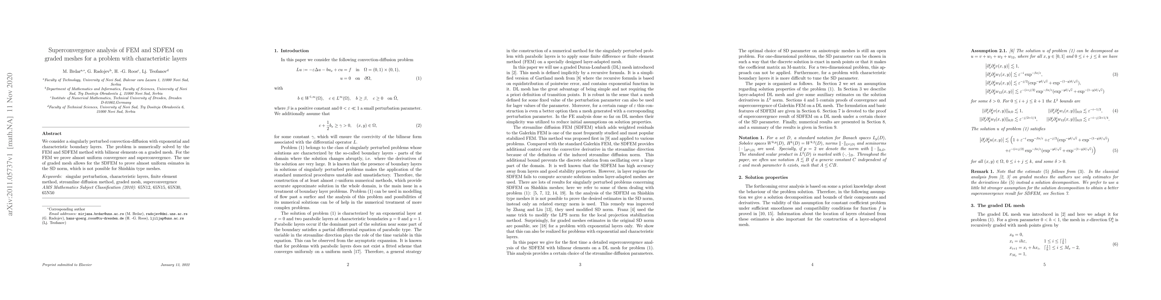 We consider a singularly perturbed convection-diffusion with exponential and characteristic boundary layers. The problem is numerically solved by the FEM and SDFEM method with bilinear elements on a graded mesh. For the FEM we prove almost uniform convergence and superconvergence. The use of graded mesh allows for the SDFEM to prove almost uniform esimates in the SD norm, which is not possible for Shishkin type meshes.