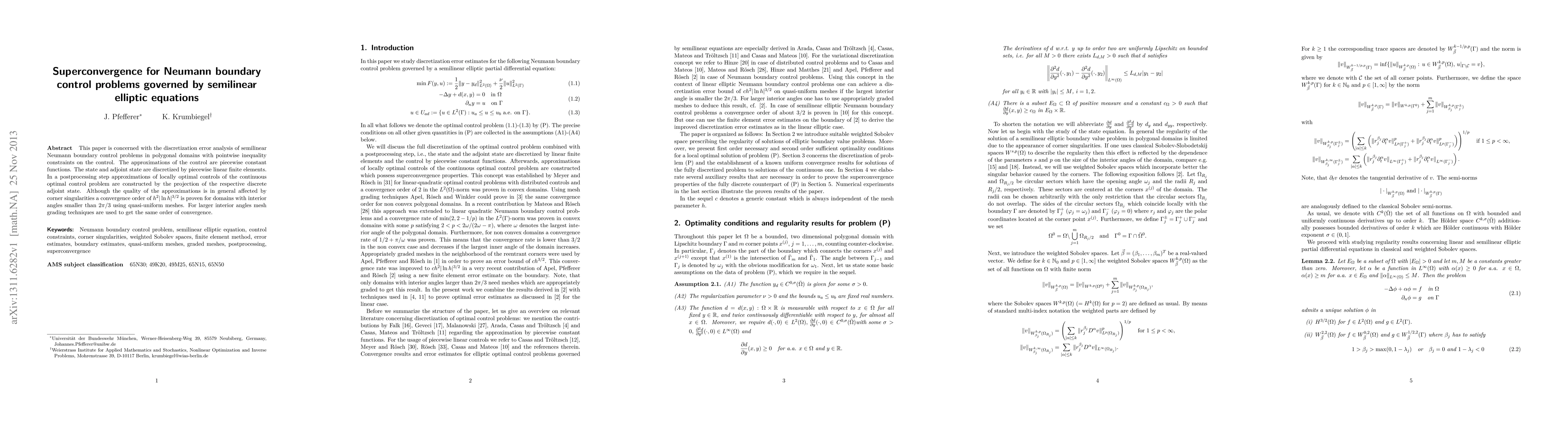 This paper analyzes the discretization error for semilinear Neumann boundary control problems, proving a superconvergence order of $h^2|\ln h|^{3/2}$ for domains with interior angles less than $2\pi/3$. For larger angles, mesh grading techniques maintain this convergence order.