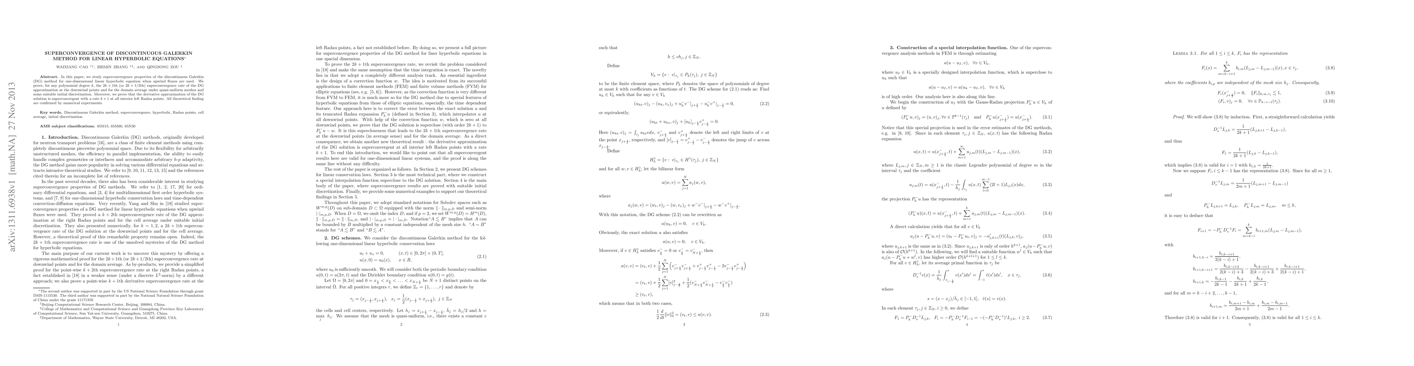 The paper presents rigorous proofs of superconvergence rates for DG methods applied to linear hyperbolic equations, including novel results for downwind points, Radau points, domain average, and cell average.