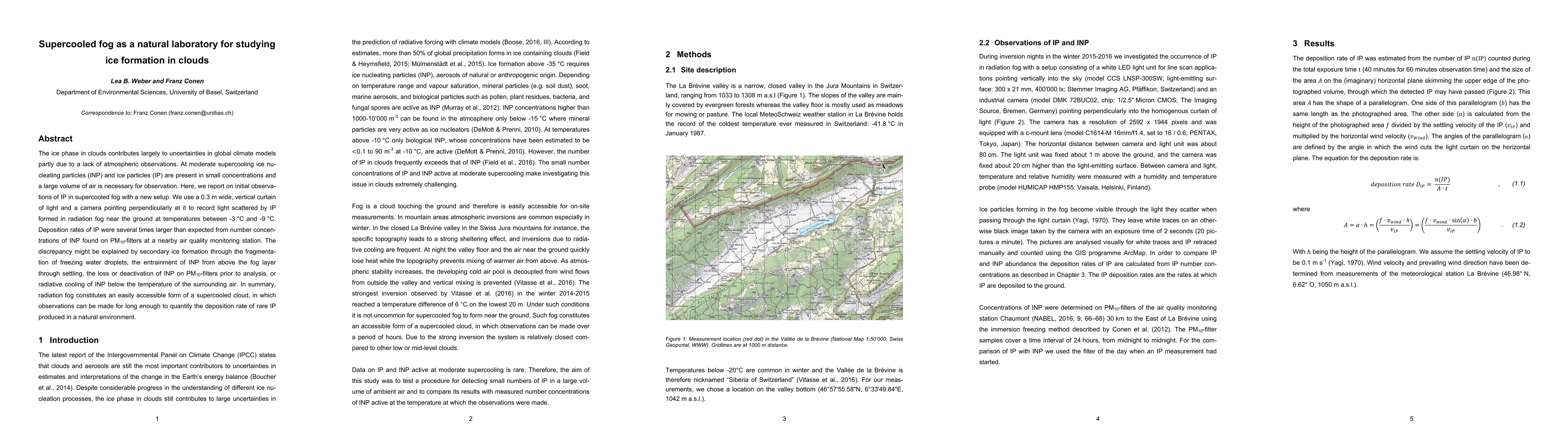The ice phase in clouds contributes largely to uncertainties in global climate models partly due to a lack of atmospheric observations. At moderate supercooling ice nucleating particles (INP) and ice particles (IP) are present in small concentrations and a large volume of air is necessary for observation. Here, we report on initial observations of IP in supercooled fog with a new setup. We use a 0.3 m wide, vertical curtain of light and a camera pointing perpendicularly at it to record light scattered by IP formed in radiation fog near the ground at temperatures between -3 {\deg}C and -9 {\deg}C. Deposition rates of IP were several times larger than expected from number concentrations of INP found on $PM_{10}$-filters at a nearby air quality monitoring station. The discrepancy might be explained by secondary ice formation through the fragmentation of freezing water droplets, the entrainment of INP from above the fog layer through settling, the loss or deactivation of INP on $PM_{10}$-filters prior to analysis, or radiative cooling of INP below the temperature of the surrounding air. In summary, radiation fog constitutes an easily accessible form of a supercooled cloud, in which observations can be made for long enough to quantify the deposition rate of rare IP produced in a natural environment.