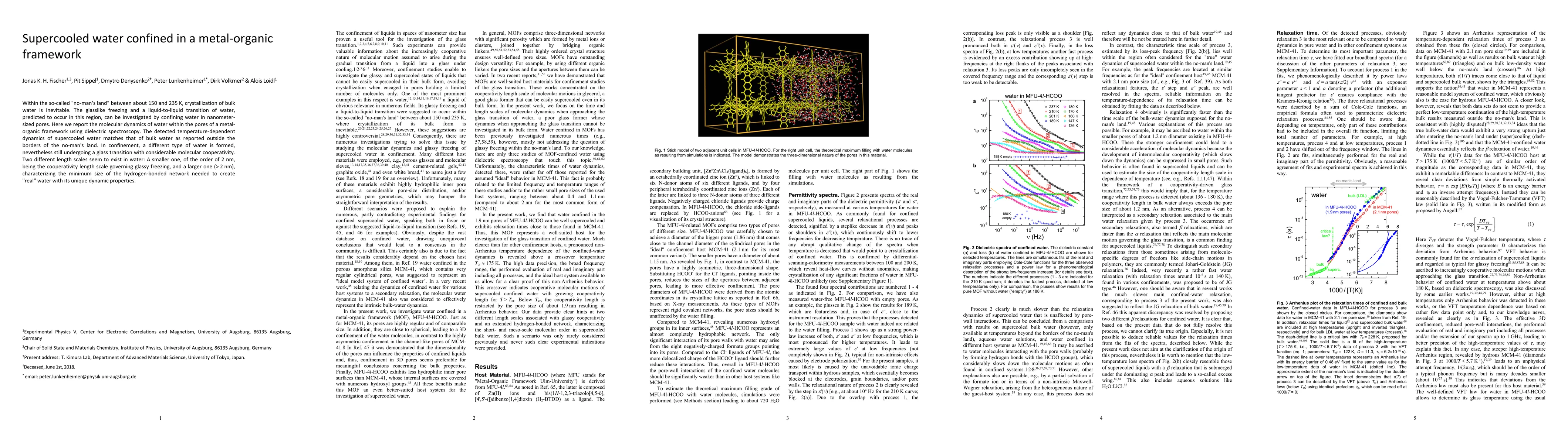 This study investigates the molecular dynamics of supercooled water confined within a metal-organic framework using dielectric spectroscopy, revealing that confined water exhibits similar glass transition dynamics to bulk water, despite forming a distinct type of water with two different length scales influencing its unique dynamic properties.