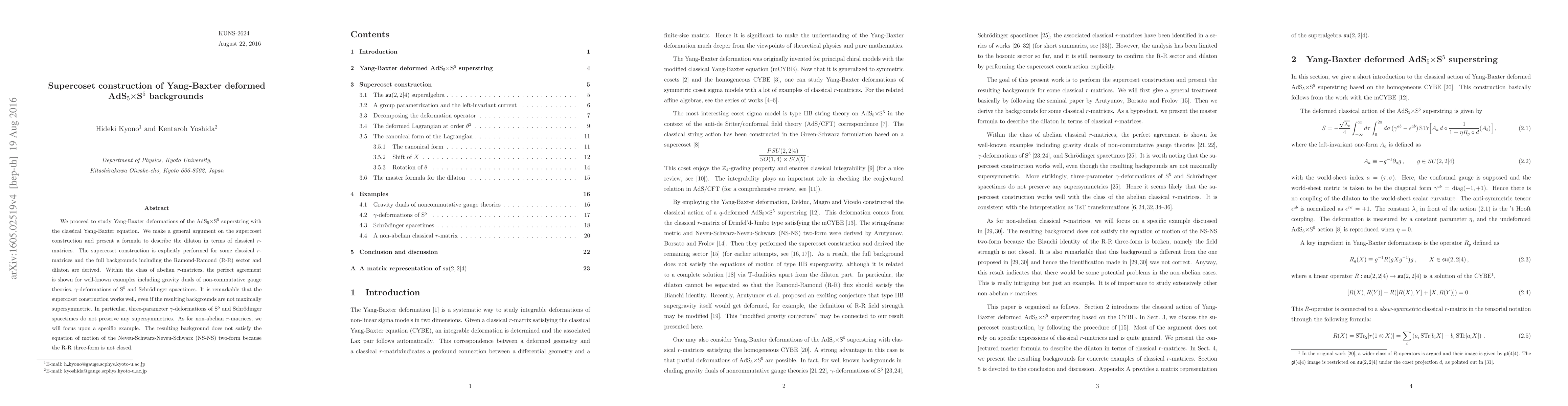We proceed to study Yang-Baxter deformations of the AdS$_5\times$S$^5$ superstring with the classical Yang-Baxter equation. We make a general argument on the supercoset construction and present the master formula to describe the dilaton in terms of classical $r$-matrices. The supercoset construction is explicitly performed for some classical $r$-matrices and the full backgrounds including the Ramond-Ramond (R-R) sector and dilaton are derived. Within the class of abelian $r$-matrices, the perfect agreement is shown for well-known examples including gravity duals of non-commutative gauge theories, $\gamma$-deformations of S$^5$ and Schr\"odinger spacetimes. It would be remarkable that the supercoset construction works well, even if the resulting backgrounds are not maximally supersymmetric. In particular, three-parameter $\gamma$-deformations of S$^5$ and Schr\"odinger spacetimes do not preserve any supersymmetries. As for non-abelian $r$-matrices, we will focus upon a specific example. The resulting background does not satisfy the equation of motion of the Neveu-Schwarz-Neveu-Schwarz (NS-NS) two-form because the R-R three-form is not closed.