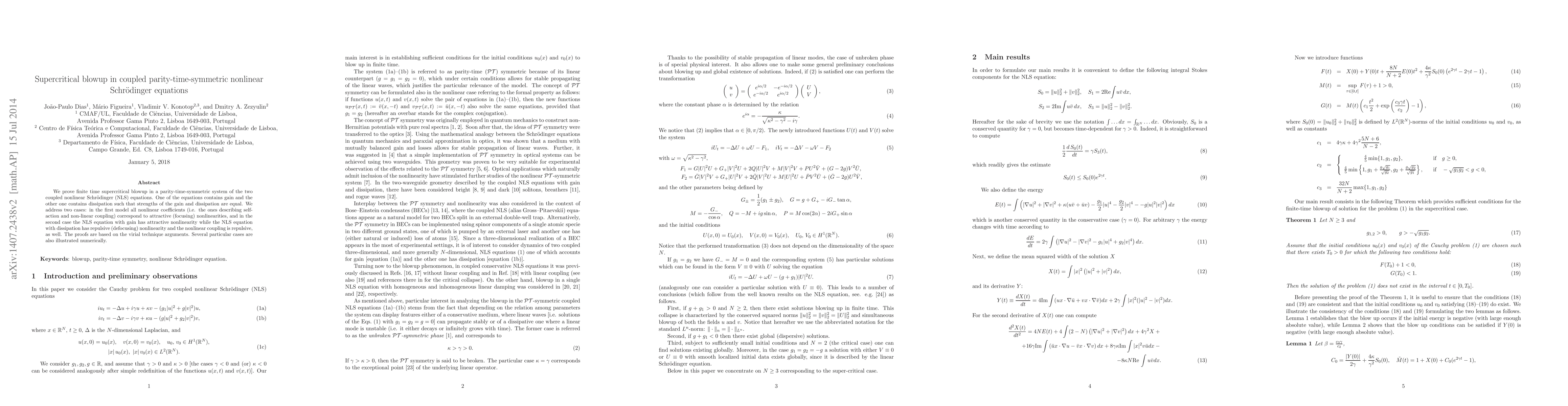 We prove finite time supercritical blowup in a parity-time-symmetric system of the two coupled nonlinear Schr\"odinger (NLS) equations. One of the equations contains gain and the other one contains dissipation such that strengths of the gain and dissipation are equal. We address two cases: in the first model all nonlinear coefficients (i.e. the ones describing self-action and non-linear coupling) correspond to attractive (focusing) nonlinearities, and in the second case the NLS equation with gain has attractive nonlinearity while the NLS equation with dissipation has repulsive (defocusing) nonlinearity and the nonlinear coupling is repulsive, as well. The proofs are based on the virial technique arguments. Several particular cases are also illustrated numerically.