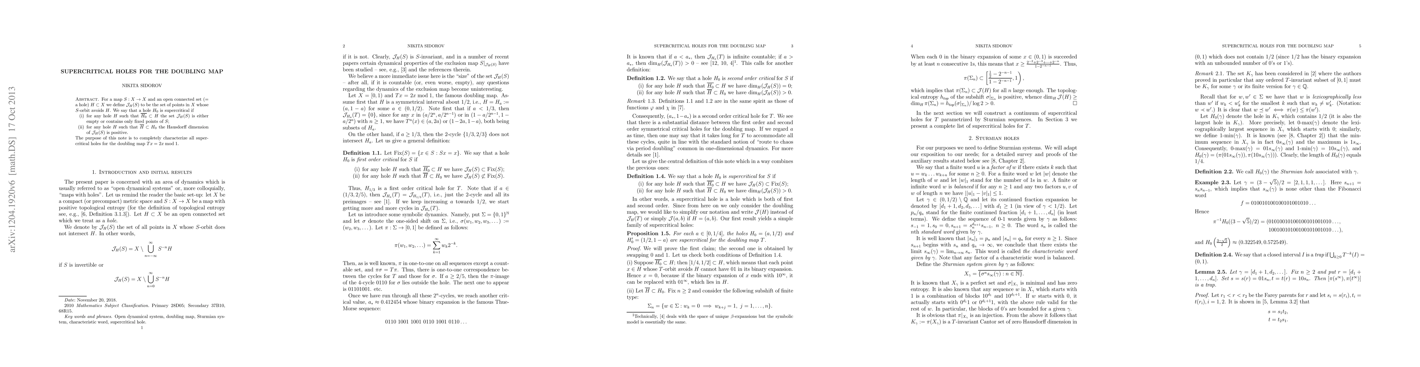 This paper characterizes supercritical holes for the doubling map $Tx=2x\bmod1$ by defining them as holes whose $S$-orbits avoid the hole and whose Hausdorff dimension is positive under certain conditions. The study provides a complete characterization of such supercritical holes.