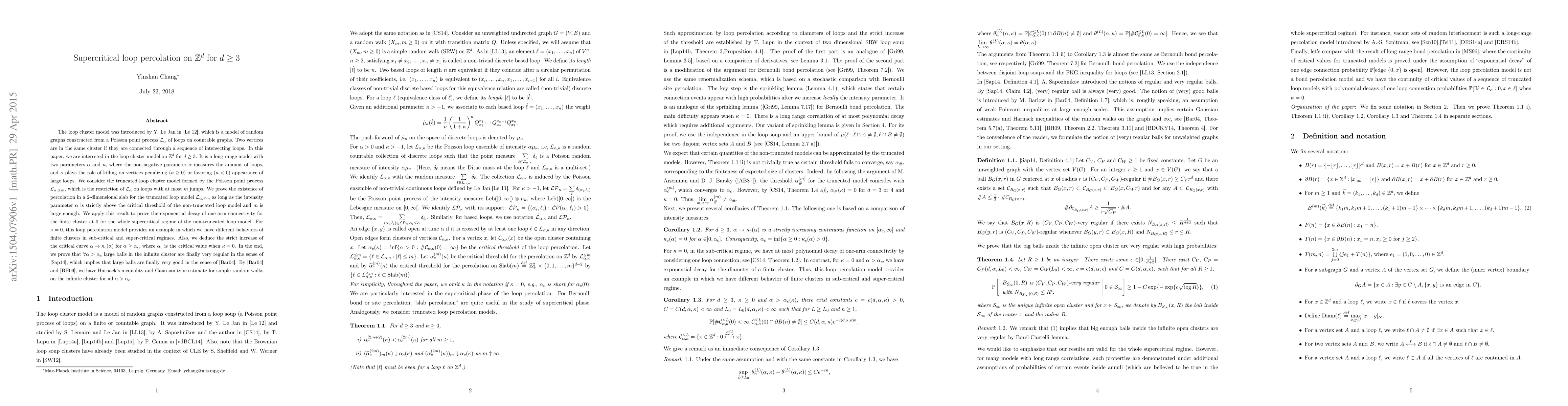 In this paper, we are interested in the loop cluster model on $\mathbb{Z}^d$ for $d\geq 3$. It is a long range model with two parameters $\alpha$ and $\kappa$, where the non-negative parameter $\alpha$ measures the amount of loops, and $\kappa$ plays the role of killing on vertices penalizing ($\kappa\geq 0$) or favoring ($\kappa<0$) appearance of large loops. We consider the truncated loop cluster model formed by the Poisson point process $\mathcal{L}_{\alpha,\leq m}$, which is the restriction of $\mathcal{L}_{\alpha}$ on loops with at most $m$ jumps. We prove the existence of percolation in a $2$-dimensional slab for the truncated loop model $\mathcal{L}_{\alpha,\leq m}$ as long as the intensity parameter $\alpha$ is strictly above the critical threshold of the non-truncated loop model and $m$ is large enough. We apply this result to prove the exponential decay of one arm connectivity for the finite cluster at $0$ for the whole supercritical regime of the non-truncated loop model. For $\kappa=0$, this loop percolation model provides an example in which we have different behaviors of finite clusters in sub-critical and super-critical regimes. Also, we deduce the strict increase of the critical curve $\alpha\rightarrow\kappa_c(\alpha)$ for $\alpha\geq\alpha_c$, where $\alpha_c$ is the critical value when $\kappa=0$. In the end, we prove that $\forall\alpha>\alpha_c$ large balls in the infinite cluster are finally very regular in the sense of \cite{Sapozhnikov2014}, which implies that large balls are finally very good in the sense of \cite{BarlowMR2094438}. By \cite{BarlowMR2094438} and \cite{BarlowHamblyMR2471657}, we have Harnack's inequality and Gaussian type estimate for simple random walks on the infinite cluster for all $\alpha>\alpha_c$.