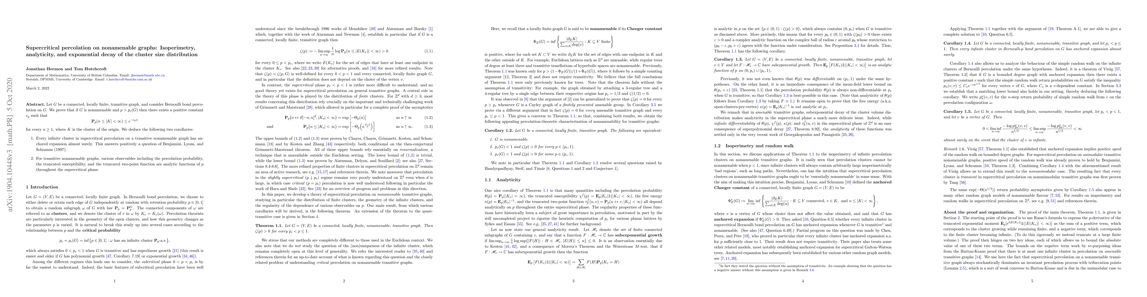 This paper proves exponential decay of the cluster size distribution in supercritical percolation on nonamenable graphs, showing that infinite clusters have anchored expansion almost surely. It also establishes analyticity of various observables throughout the supercritical phase.
