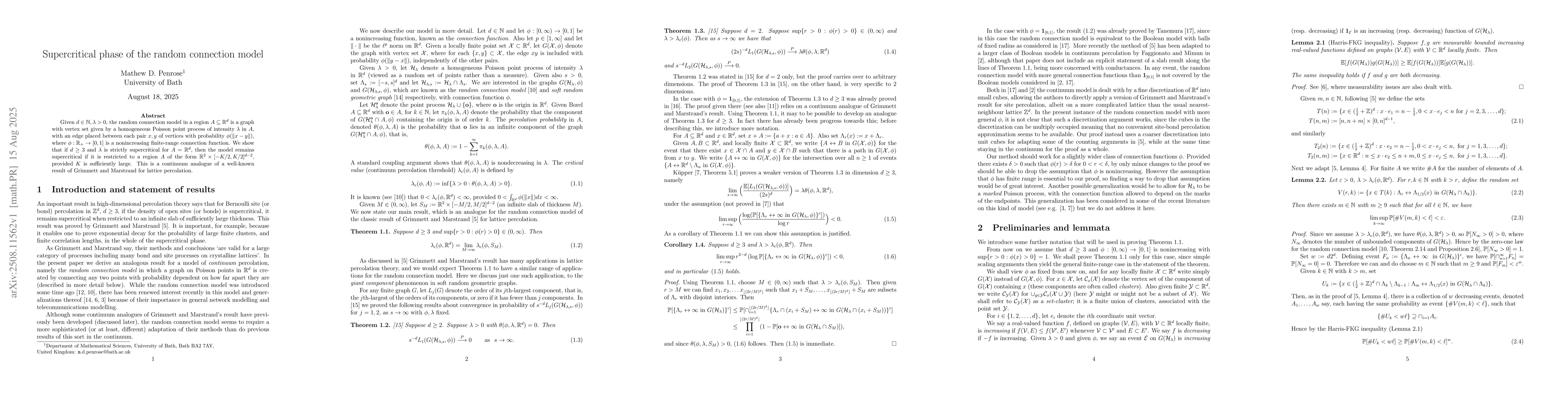 Given $d \in {\bf N}, \lambda >0$, the random connection model in a region $A \subseteq {\bf R}^d$ is a graph with vertex set given by a homogeneous Poisson point process of intensity $\lambda $ in $A$, with an edge placed between each pair $x,y$ of vertices with probability $\phi(\|x-y\|)$, where $\phi: {\bf R}_+ \to [0,1]$ is a nonincreasing finite-range connection function. We show that if $d \geq 3$ and $\lambda$ is strictly supercritical for $A = {\bf R}^d$, then the model remains supercritical if it is restricted to a region $A$ of the form ${\bf R}^2 \times [-K/2,K/2]^{d-2}$, provided $K$ is sufficiently large. This is a continuum analogue of a well-known result of Grimmett and Marstrand for lattice percolation.