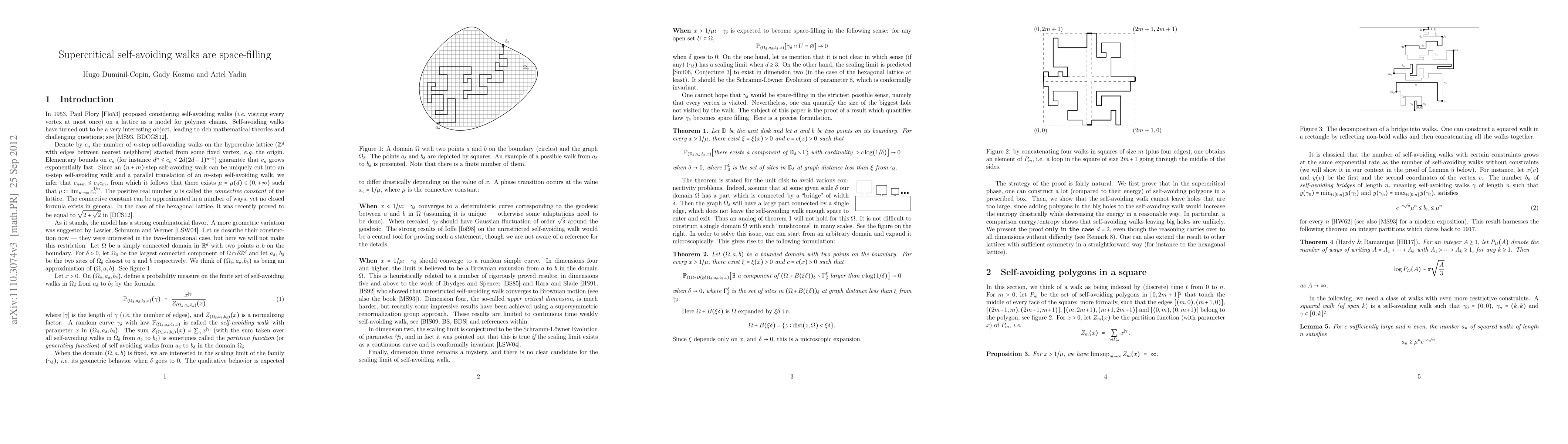 Summary: This paper demonstrates that random self-avoiding walks between two boundary points in a finite lattice domain become space-filling in the scaling limit when the parameter is supercritical. The study establishes the trajectory's behavior under supercritical conditions.
