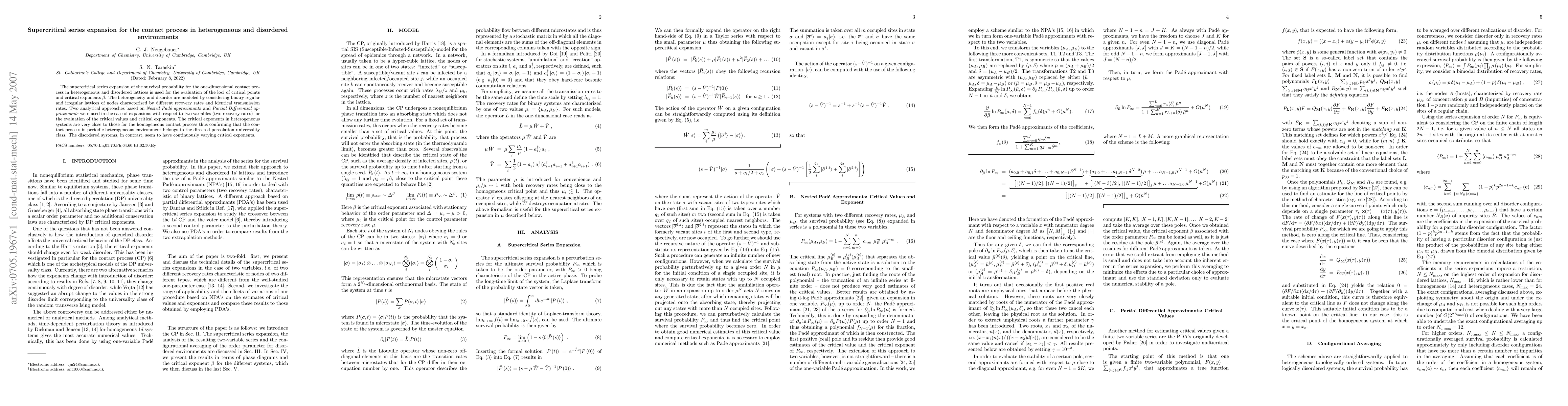 The supercritical series expansion of the survival probability for the one-dimensional contact process in heterogeneous and disordered lattices is used for the evaluation of the loci of critical points and critical exponents $\beta$. The heterogeneity and disorder are modeled by considering binary regular and irregular lattices of nodes characterized by different recovery rates and identical transmission rates. Two analytical approaches based on Nested Pad\'e approximants and Partial Differential approximants were used in the case of expansions with respect to two variables (two recovery rates) for the evaluation of the critical values and critical exponents. The critical exponents in heterogeneous systems are very close to those for the homogeneous contact process thus confirming that the contact process in periodic heterogeneous environment belongs to the directed percolation universality class. The disordered systems, in contrast, seem to have continuously varying critical exponents.